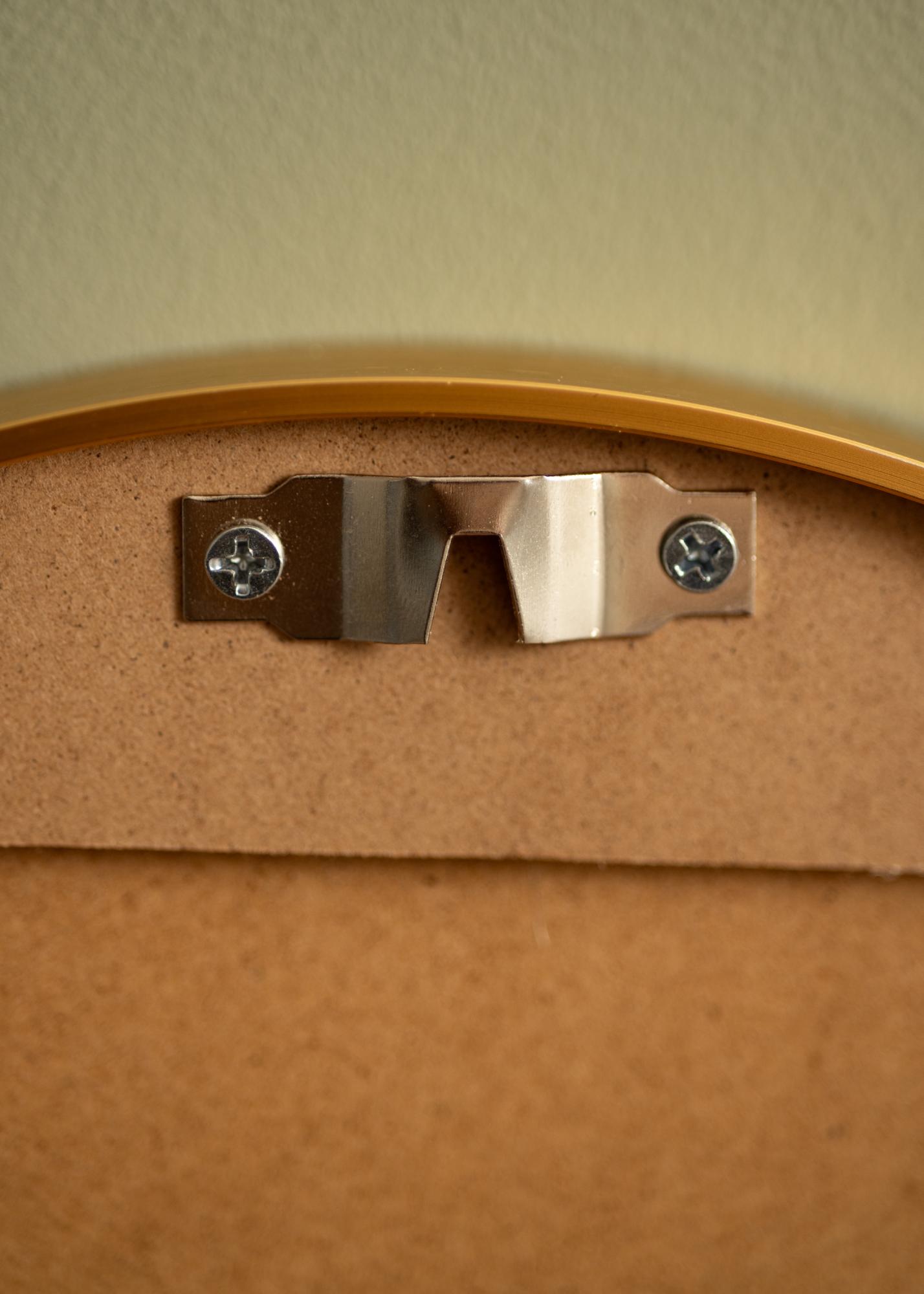 KAILA Round Mirror Edge Gold -peiliä on saatavilla useassa eri koossa, ja tämän version halkaisija on 30 cm. Peilin taustapuoli on varustettu seinäkiinnikkeellä, jonka avulla peili kiinnittyy seinälle helposti ja vakaasti. Yhteensopivat ruuvi ja tulppa toimitetaan mukana.