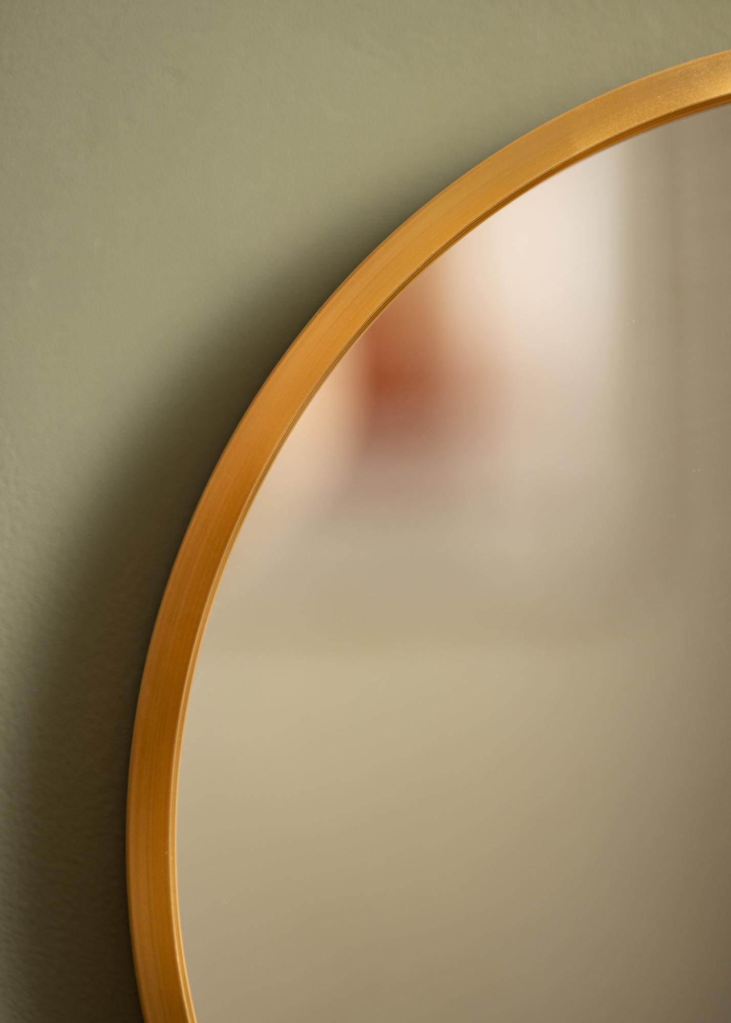 Pyöreä peili tyylikästä ruotsalaista designia metallikehyksellä, jossa on kaunis kullanvärinen viimeistely. Kehys on harjattu pinnaltaan, mikä tuo kauniiseen kullanväriin hieman mattapintaisemman ilmeen. Kehys on lisäksi trendikkään ohut sekä - koosta riippuen - syvyydeltään 30-40 mm, minkä ansiosta peili tulee hieman ulospäin seinästä ja luo vaikuttavan 3D-efektin. Kehyksen syvyys luo myös peiliin aidon ja jykevän tunnun samalla, kun se säilyttää minimalistisen ilmeensä.