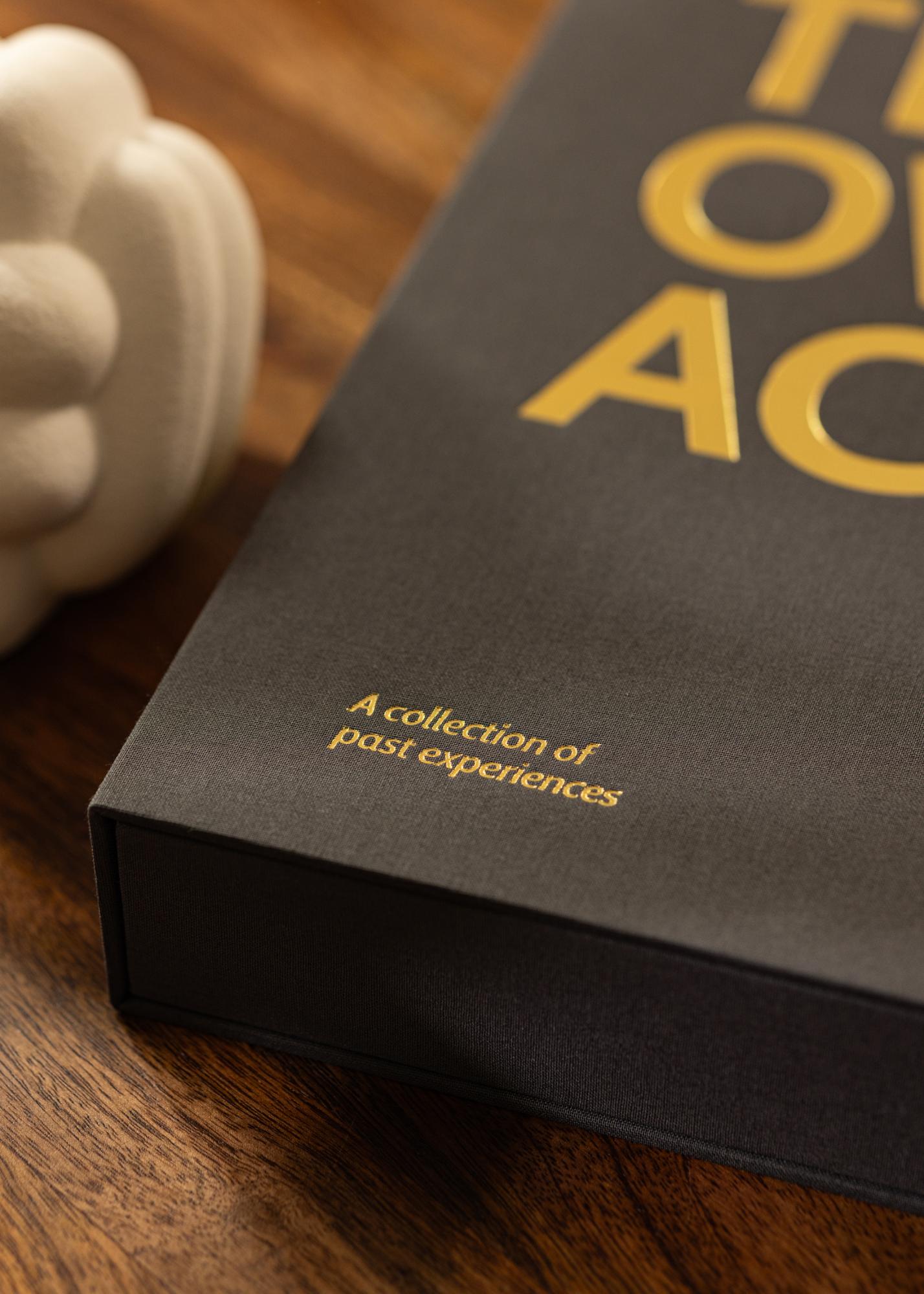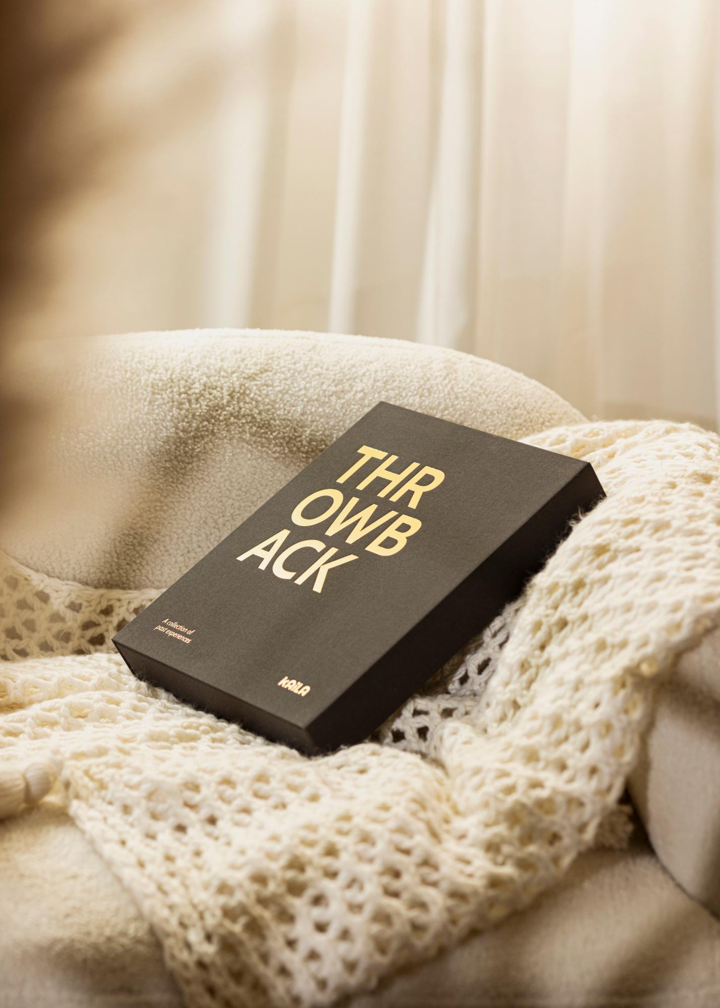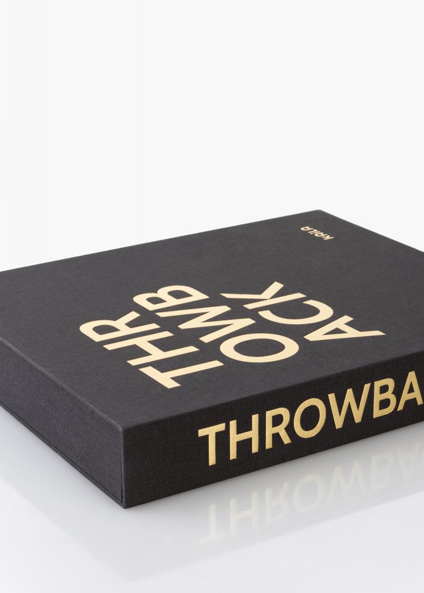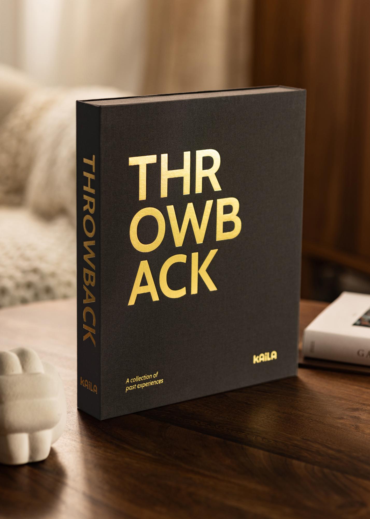 Tässä trendikkäässä valokuva-albumissa on ylellisen kahvipöytäkirjan tuntu ja on siksi saanut kutsumanimekseen Coffee Table Photo Album. Albumi on kotelon muotoinen ja siinä on hyvin eksklusiivinen tuntu. Se on päällystetty mustalla kankaalla ja sen kanteen ja selkään on painettu kultakirjaimin teksti ”THROWBACK”. Tämä tuttu ilmaisu, joka viittaa menneisiin muistikuviin antaa valokuva-albumille modernin ja itsetietoisen ilmeen, joka erottaa sen tavallisista, klassisista albumeista. Albumin vasemmassa alareunassa on myös alaotsikko, jossa lukee: ”A collection of past experiences”.
