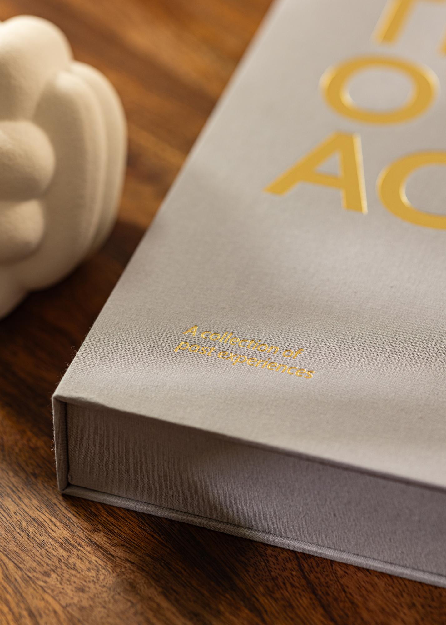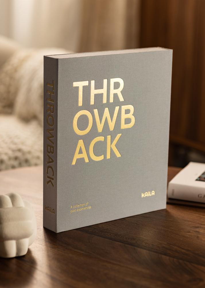 Tässä trendikkäässä valokuva-albumissa on ylellisen kahvipöytäkirjan tuntu ja on siksi saanut kutsumanimekseen Coffee Table Photo Album. Albumi on kotelon muotoinen ja siinä on hyvin eksklusiivinen tuntu. Se on päällystetty harmaalla kankaalla ja sen kanteen ja selkään on painettu kultakirjaimin teksti ”THROWBACK”. Tämä tuttu ilmaisu, joka viittaa menneisiin muistikuviin antaa valokuva-albumille modernin ja itsetietoisen ilmeen, joka erottaa sen tavallisista, klassisista albumeista. Albumin vasemmassa alareunassa on myös alaotsikko, jossa lukee: ”A collection of past experiences”.