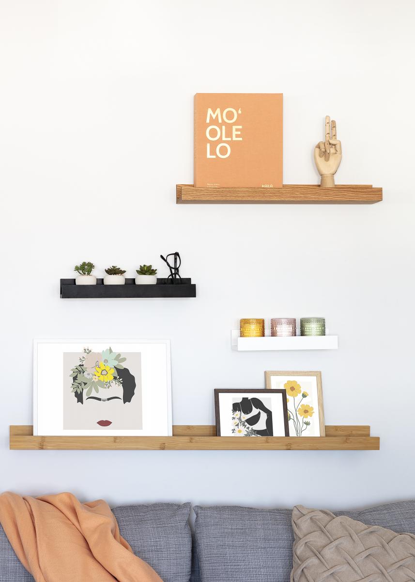Tämä hylly on valmistettu kauniista bambusta. Se on pelkistetyn suoralinjainen ja 80 cm pitkä. Itse hyllytasossa on pieni ura, joka toimi liukuesteenä seinään nojaaville tauluille. Hyllyssä on esiporatut reiät ja mukana seuraavat ruuvit sekä niitä peittämään tulpat. Näppärää!