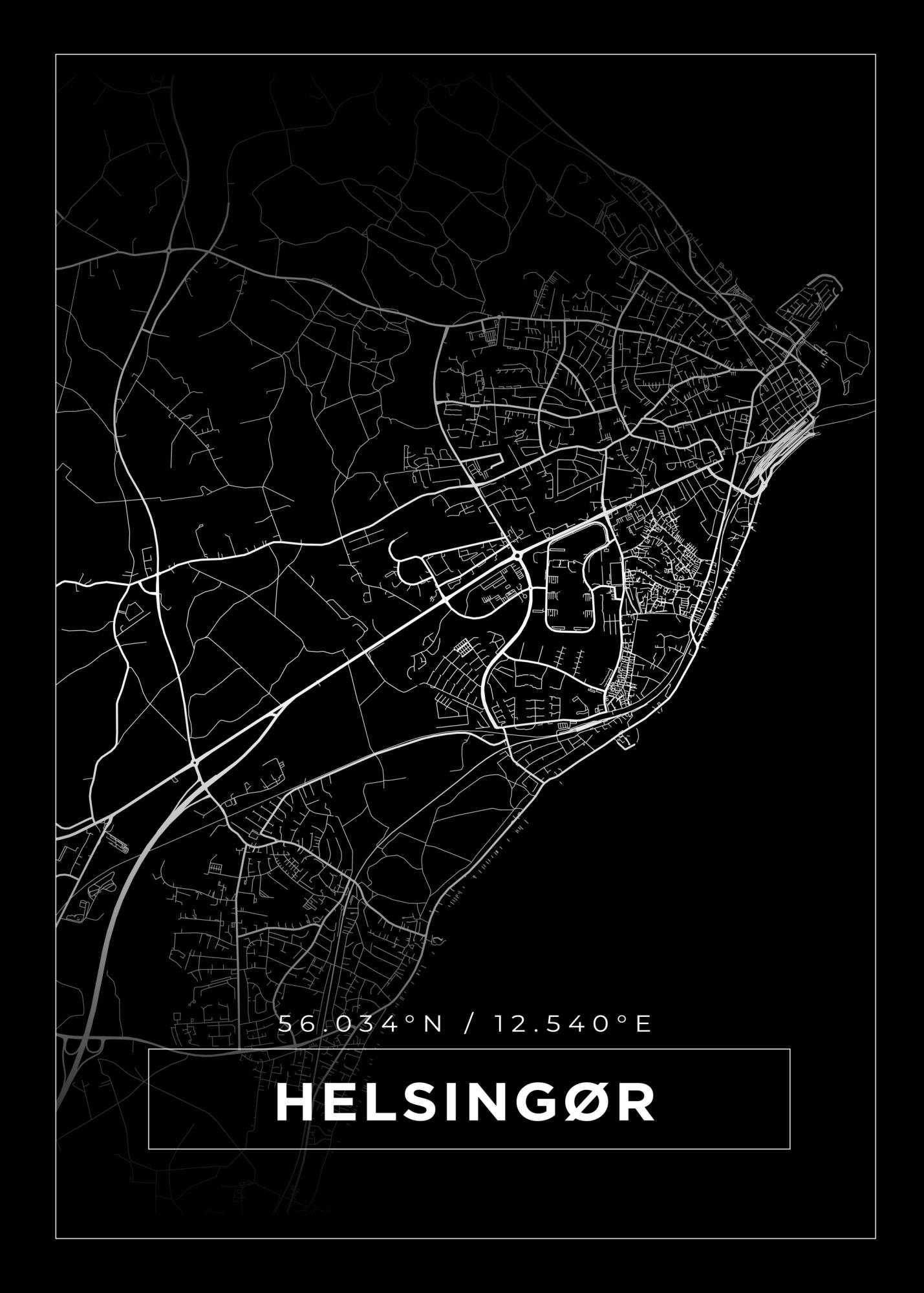 Kartta - Helsingør - Musta Juliste (30x40 cm)