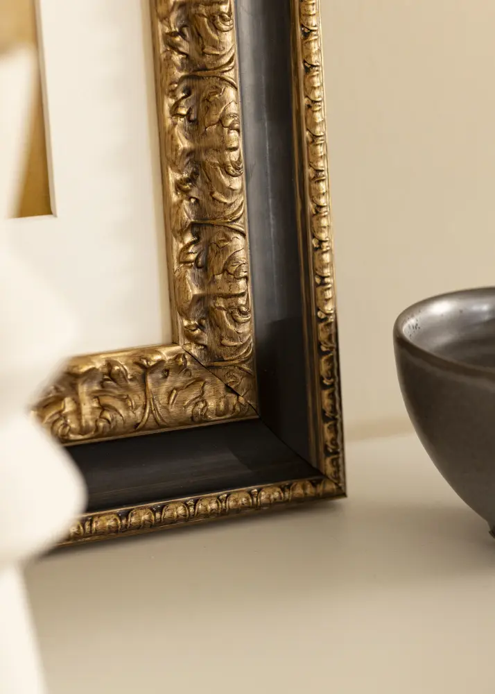 Drottningholm Kullanvärinen on kaunis retrokehys Italiasta. Kehys on käsinmaalattu ja artesaanityönä viimeistelty. Siinä on todella kauniisti koristeltu kultainen malli ja leveä musta kehys hienona yksityiskohtana. Täydellinen retrotyyliseen sisustukseen.
