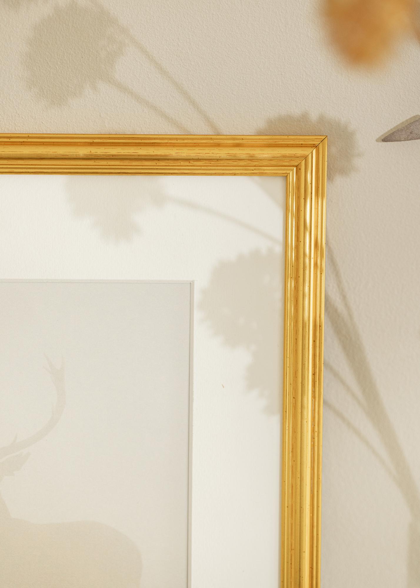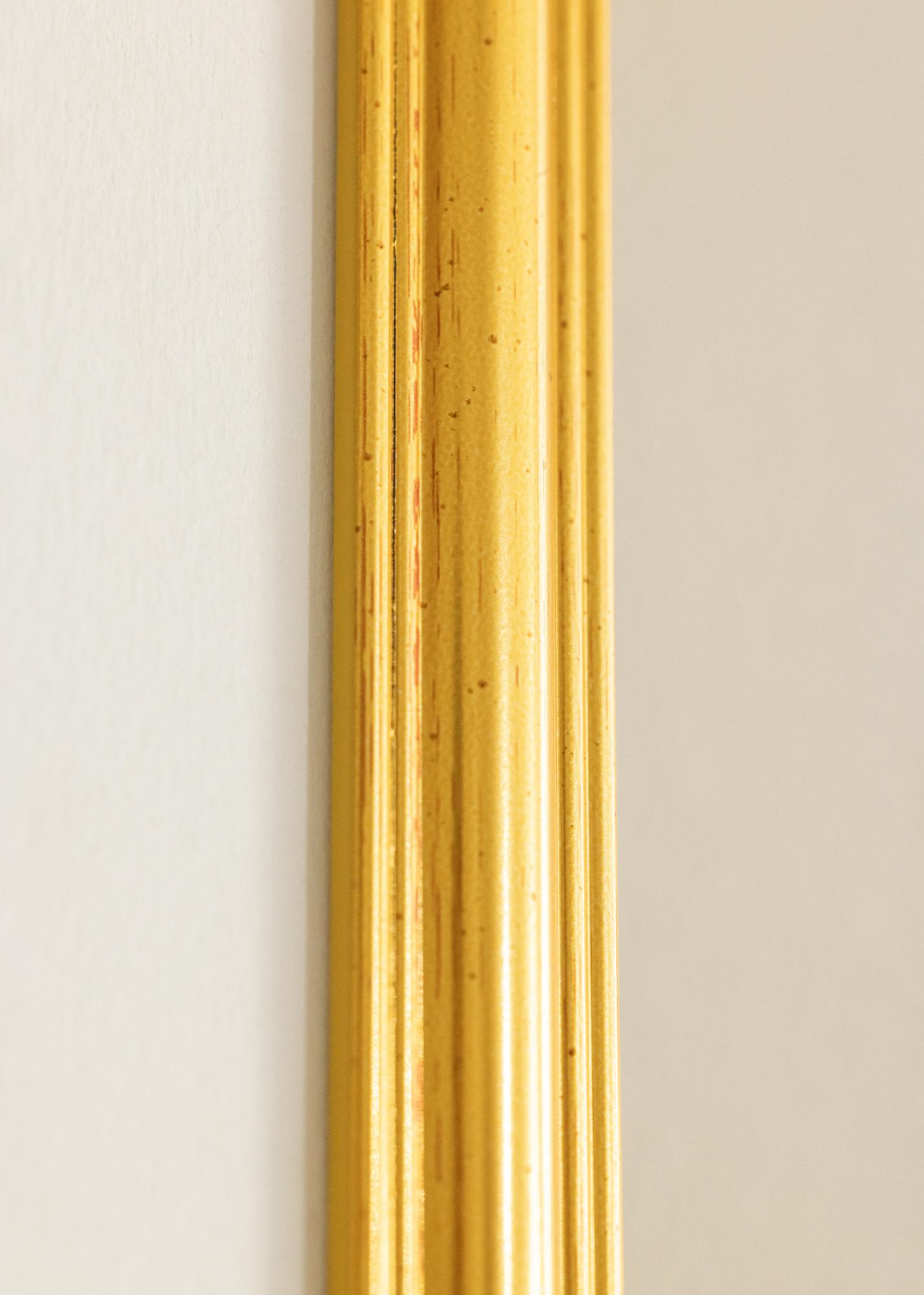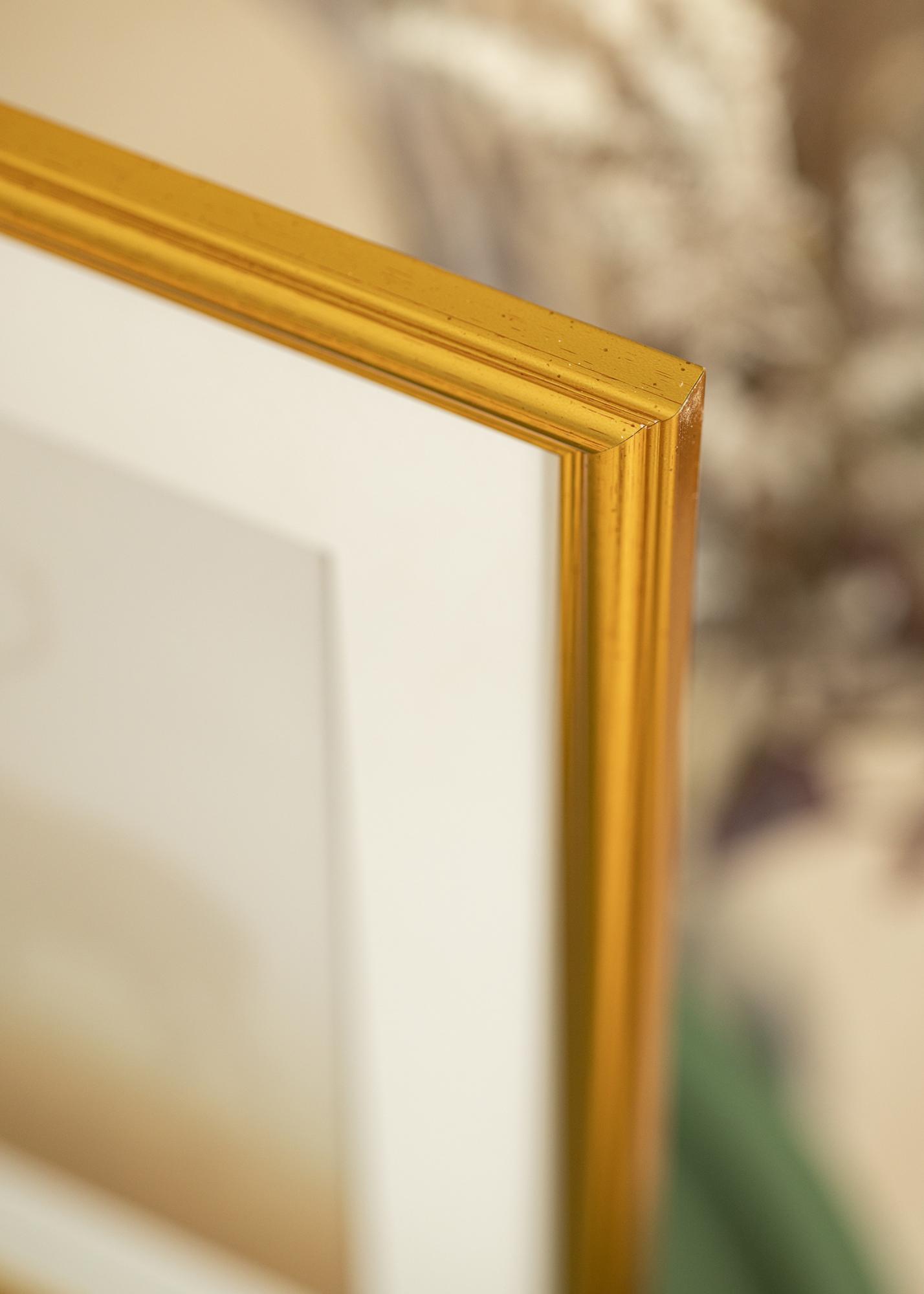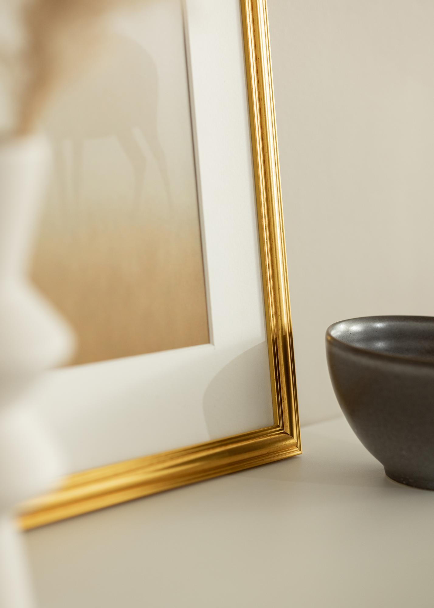 Käynnistä kehysvalitsin »Frigg käy hyvin sinulle, jos etsit leveää kullanväristä kehystä. Perinteisen muotoilun johdosta se sopii useimpiin huoneisiin ja tiloihin.