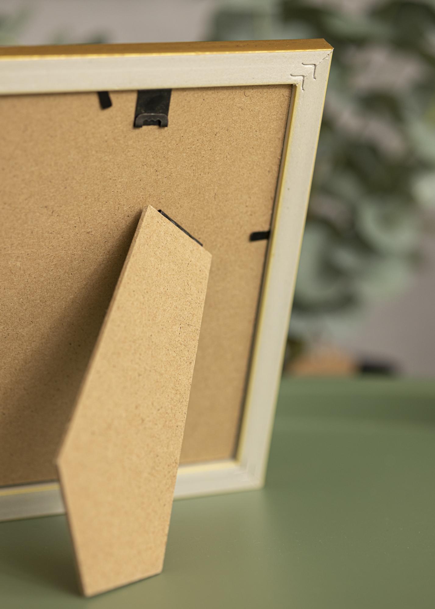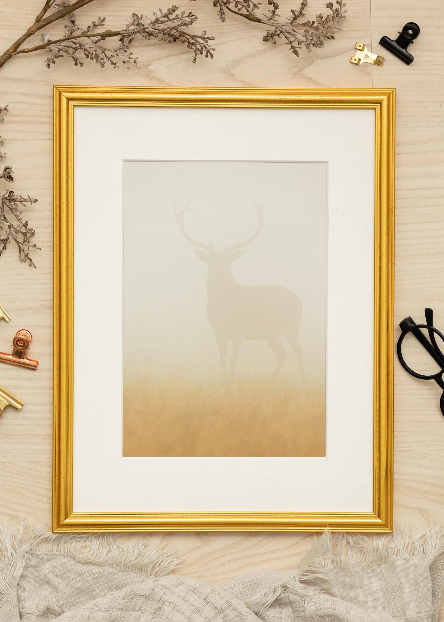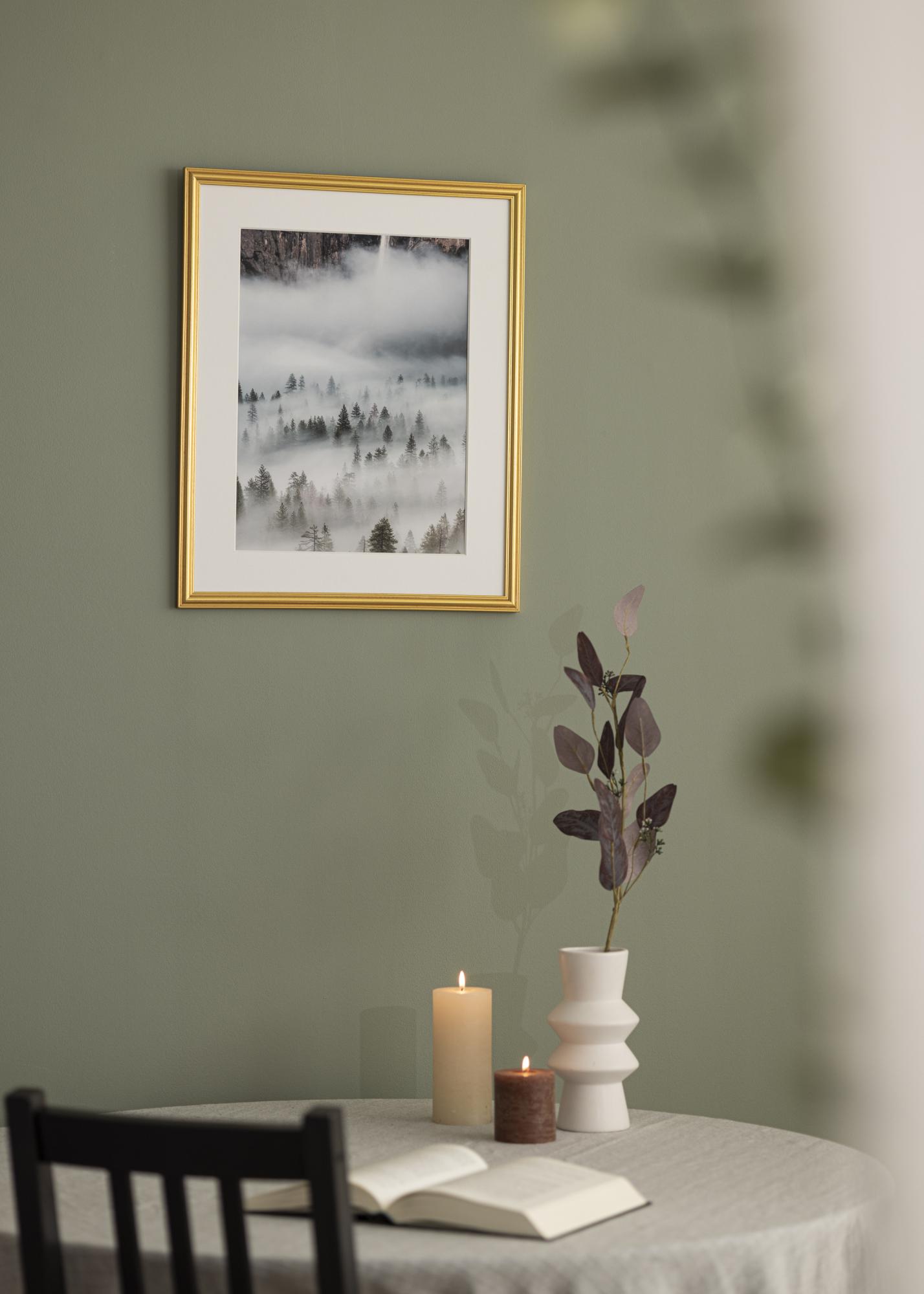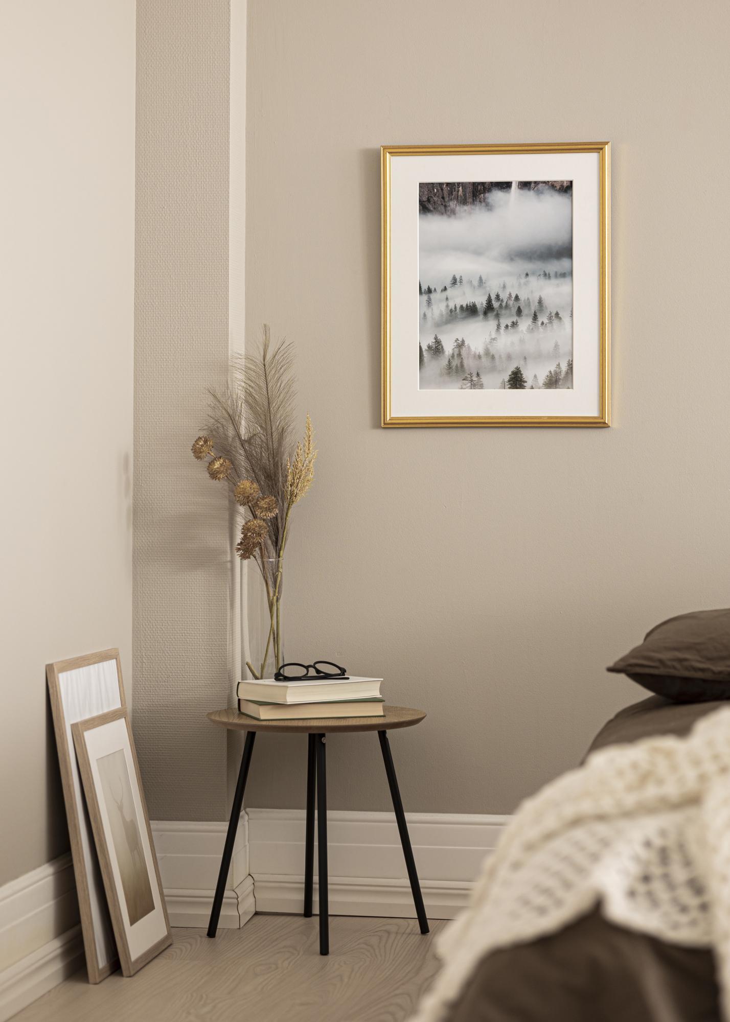 Käynnistä kehysvalitsin »Frigg käy hyvin sinulle, jos etsit leveää kullanväristä kehystä. Perinteisen muotoilun johdosta se sopii useimpiin huoneisiin ja tiloihin.