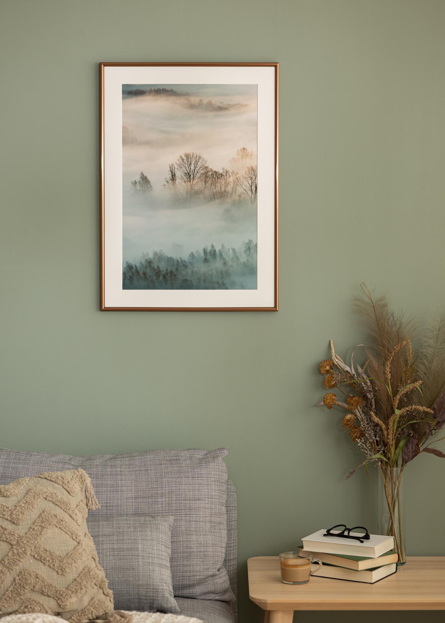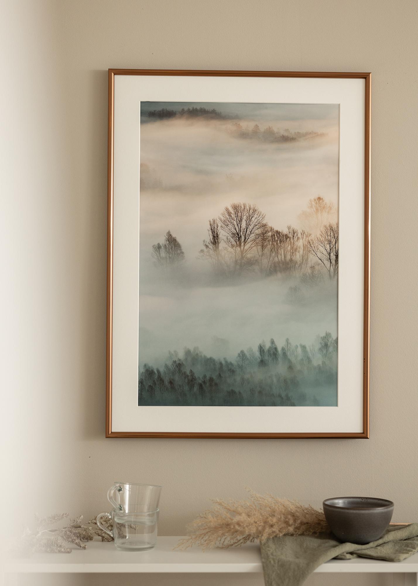 Tämä on trendikäs kehys, jossa on kiiltävä kuparinvärinen pinta. Puoliksi pyöristetty kehyslista on kapea, mutta 19 mm leveä syvyyssuunnassa, joten kehys tulee hieman ulos seinästä. Tämä tekee tehokkaan vaikutuksen, joka saa kuvasi vangitsemaan katseet. Voit valita vapaasti haluatko käyttää taulukehystä pysty- tai vaakatasossa.