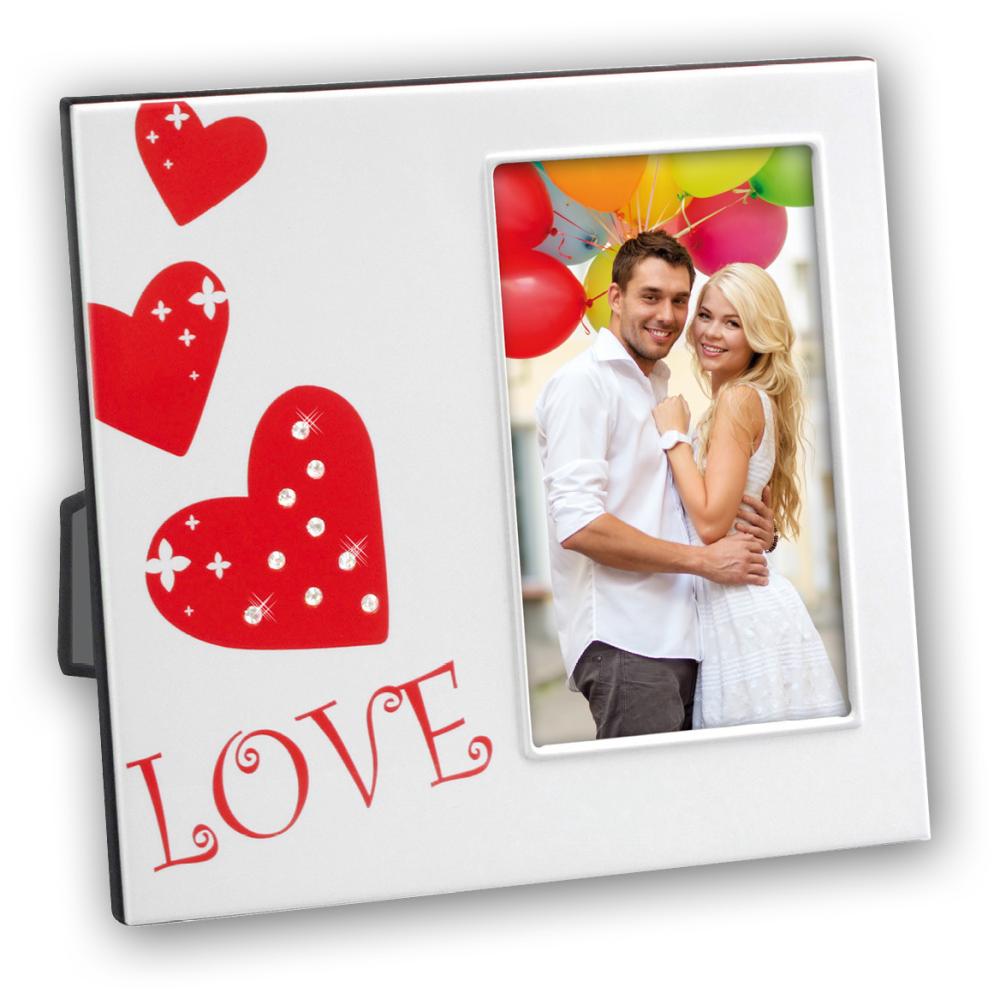 Metallikehys punaisilla sydämillä sekä "Love"-tekstillä. Yhden 10x15 cm kuvan kehys takaa oikeanlaisen tunnelman lempikuvallesi.