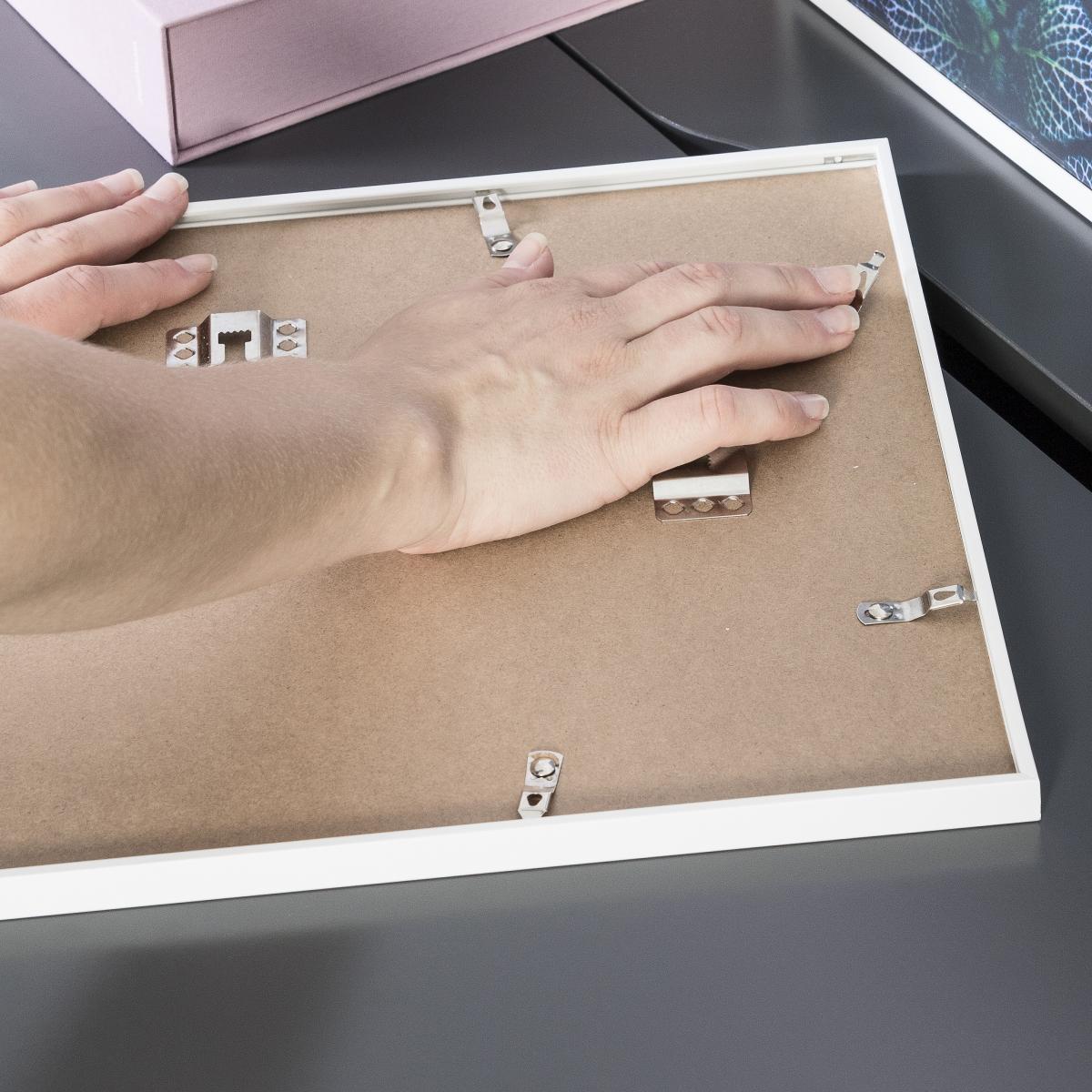 Kehyksen suojalasi on valmistettu akryylimuovista, joka on särkymätön, kestävä materiaali. Lisäksi akryylilasilla varustetut kehykset ovat huomattavasti kevyempiä kuin perinteisellä lasilla varustetut. MDF-levystä valmistettua takakappaletta on helppo irroittaa vääntyvien metalliklipsien ansiosta. Klipsit on helppo vääntää aina tarpeen mukaan ilman erityisiä työkaluja. Kehys on mahdollistaa ripustaa seinälle niin pysty- kuin vaakasuoraan.