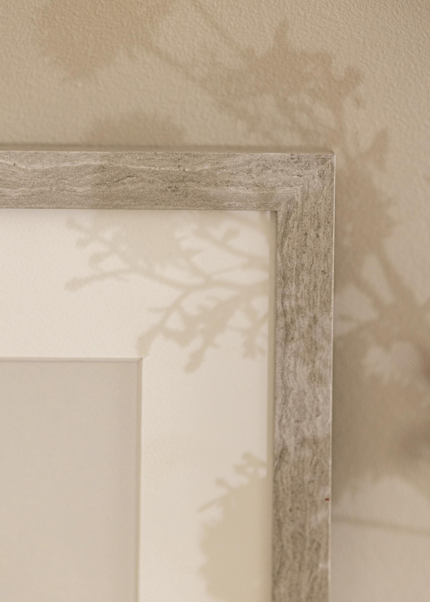 Valokuvakehyksen valmistukseen on käytetty MDF-materiaalia, jota on viilutettu kauniin harmaalla, mattapintaisella ja puurakenteisella pinnalla. Suojalasina on aitoa lasia. Kuvat ja aukkopahvi sijoitetaan kehykseen irrottamalla sen takaosaa taipuvia metalliniittejä kääntämällä.