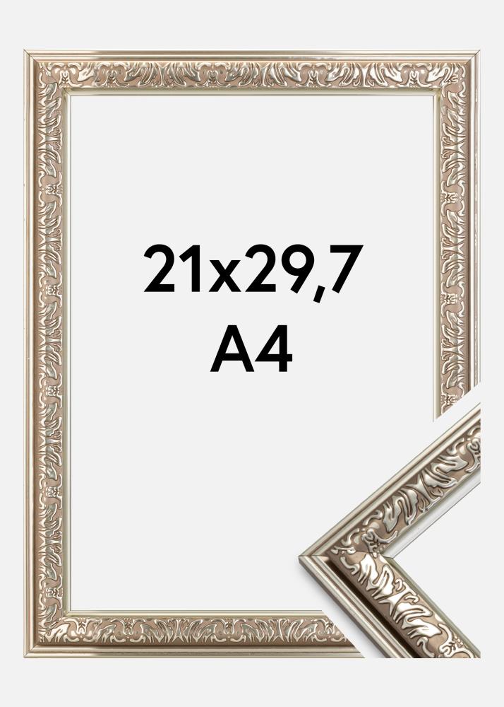 Tyylikkäät, retrotyyliset Nostalgia Hopeanvärinen- kehykset, joissa on hieno koristelu. Sopivat hyvin etsiessäsi leveitä retrokehyksiä hienoimmille kuvillesi.