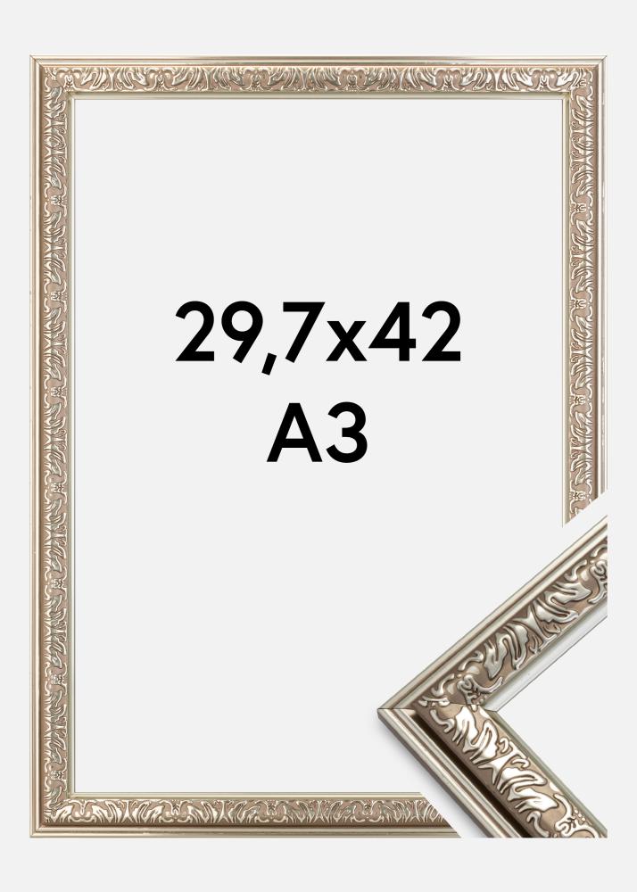Tyylikkäät, retrotyyliset Nostalgia Hopeanvärinen- kehykset, joissa on hieno koristelu. Sopivat hyvin etsiessäsi leveitä retrokehyksiä hienoimmille kuvillesi.