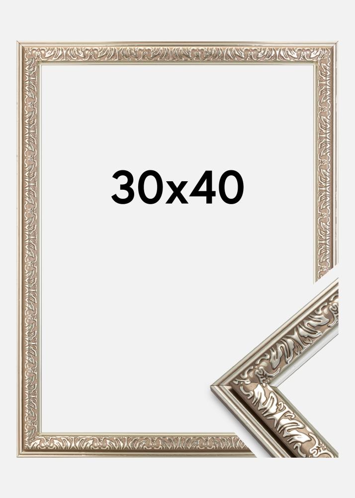 Tyylikkäät, retrotyyliset Nostalgia Hopeanvärinen- kehykset, joissa on hieno koristelu. Sopivat hyvin etsiessäsi leveitä retrokehyksiä hienoimmille kuvillesi.