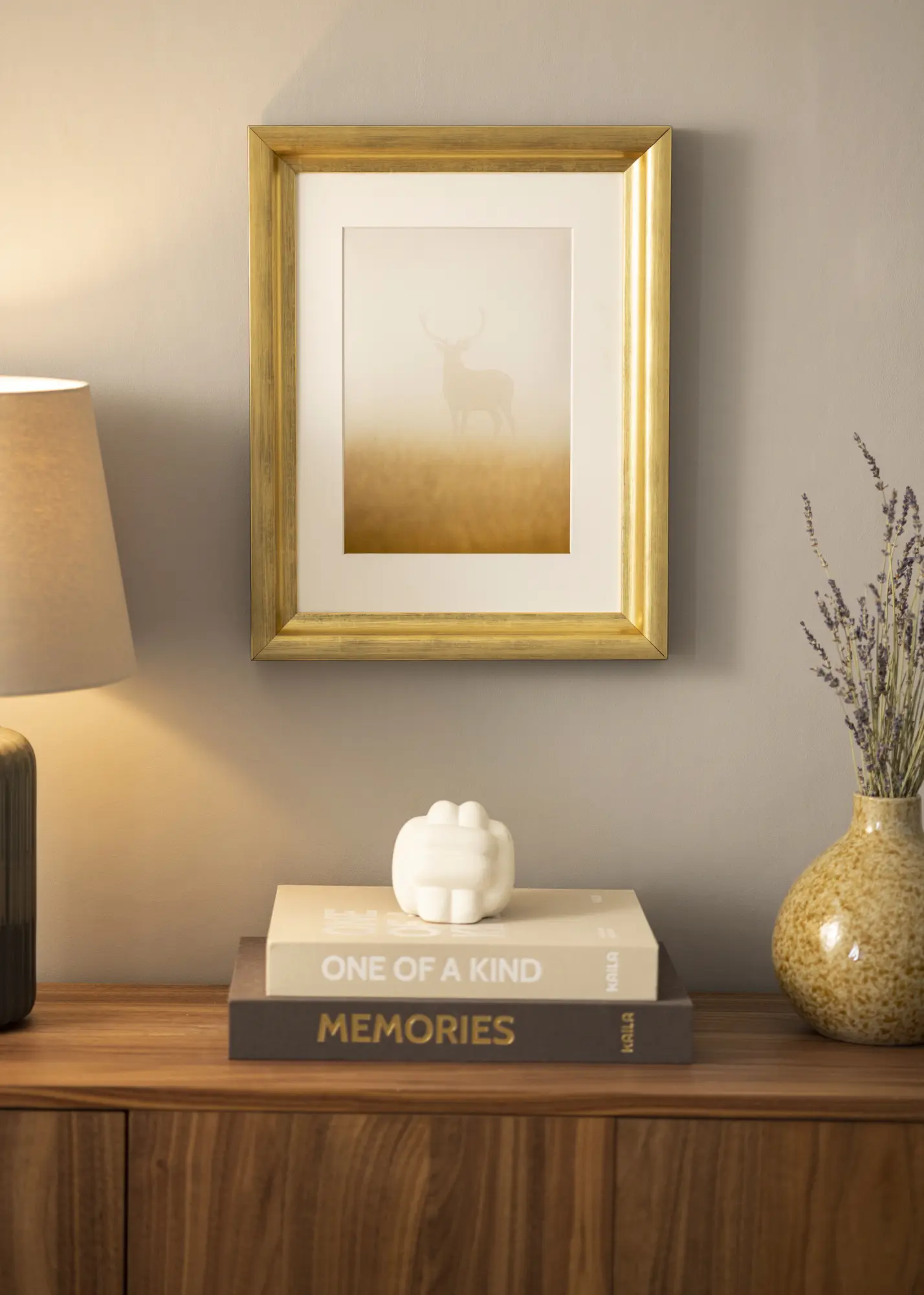 Klassinen taulukehys, jonka koon voit valita itse. Laaja ja syvä profiili takaa, että tämä kehys huomataan. Kehys on miellyttävän kullansävyinen, mikä antaa kuvillesi mukavan ja tunnelmallisen vivahteen.