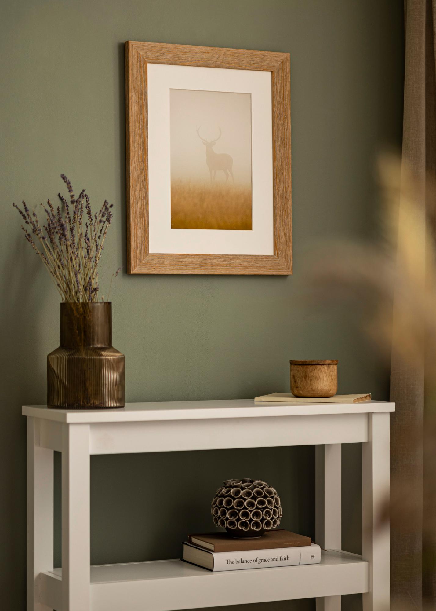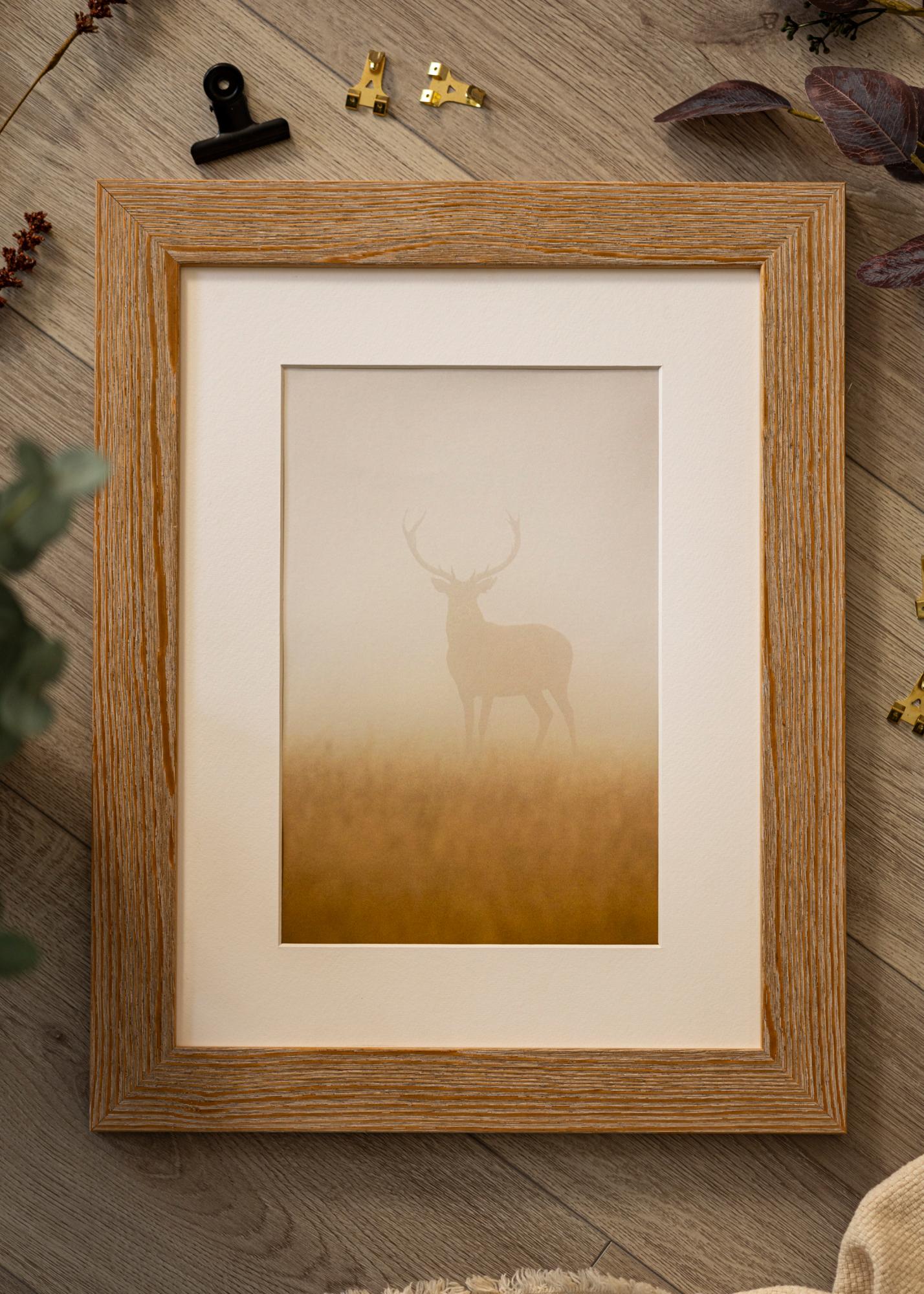 Klassinen puukehys selkeillä puunsyillä antaa kuvalle tunteen luonnosta ja villieläimistä.