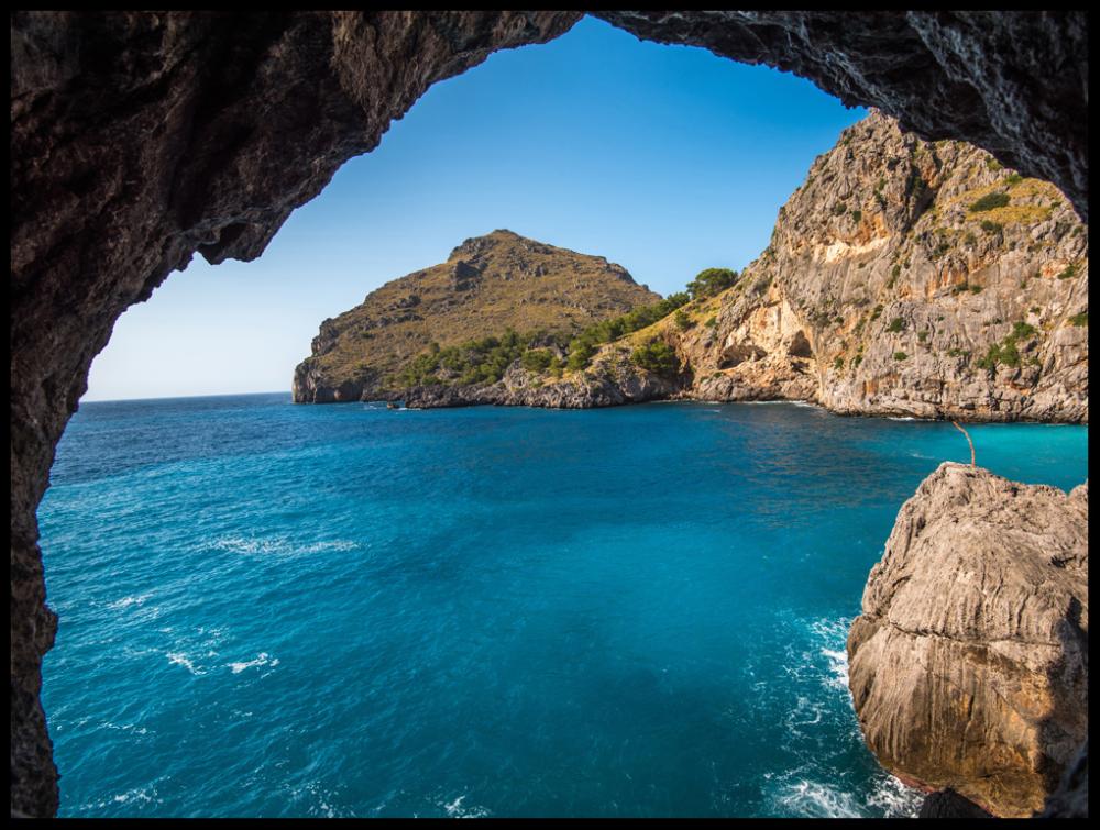 Juliste, jossa näkymä kallioluolaan Välimeren rannalla. Punaruskeat kivet sointuvat hienosti turkoosinsiniseen mereen ja taivaaseen, kaunis maalaus unelmoi eteläisille leveysasteille pääsystä. Valokuvaan sopii hyvin hienot kehykset, joissa on valkoinen kulunut vaikutelma tai haalistunut puu.