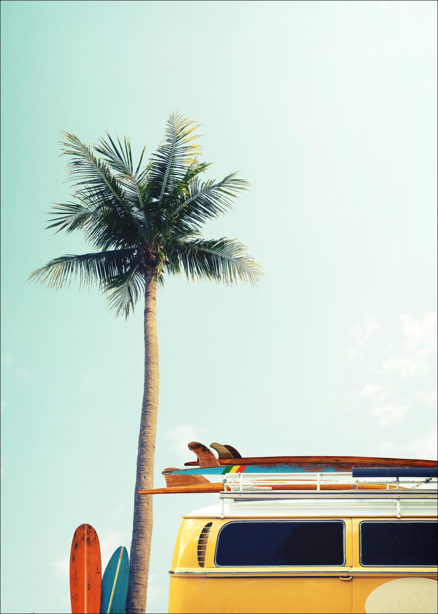 Fotografinen juliste klassisesta Volkswagen-mikroautosta surffilautoineen, pysäköitynä palmun alle pilvettömälle taivaalle. Värikäs juliste, joka tuo ihanan kesän ja vapauden tunteen. Yhdistele mielellään muiden suosikkien kanssa suuremmalle tauluseinälle.
