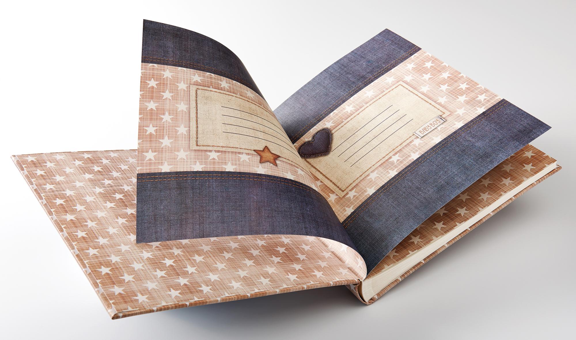 Vauva-albumi, jossa on teksti "Little baby Boy" etusivulla. Albumin kansi on koristelu lukuisilla pienillä tähdillä tehden siitä kutsuvan ja mukavan käyttää..