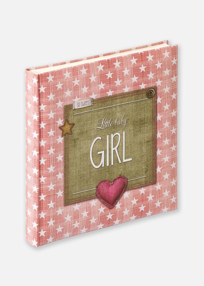 Vauva-albumi, jossa on teksti "Little baby Girl" etusivulla. Albumin kansi on koristelu lukuisilla pienillä tähdillä tehden siitä kutsuvan ja mukavan käyttää.
