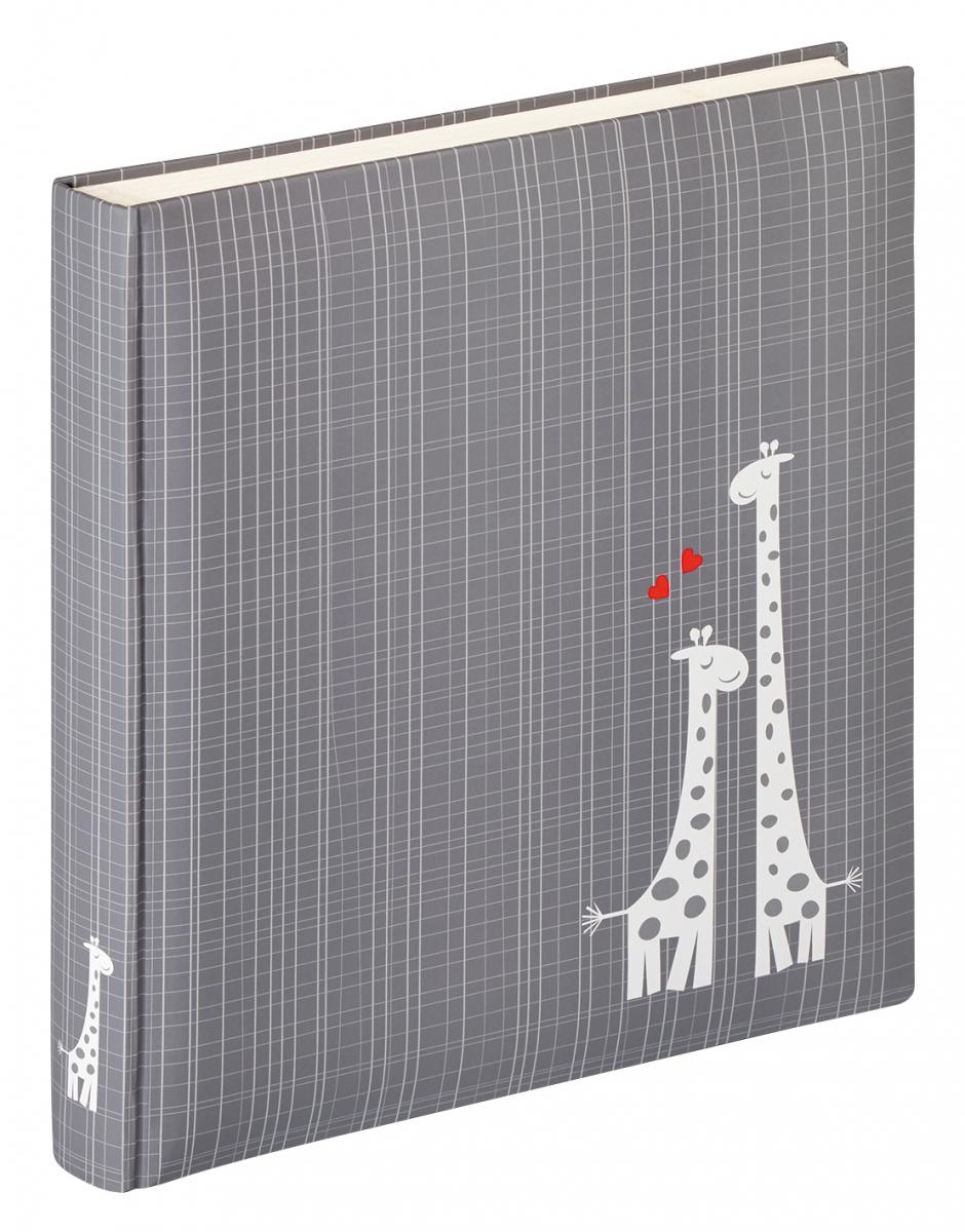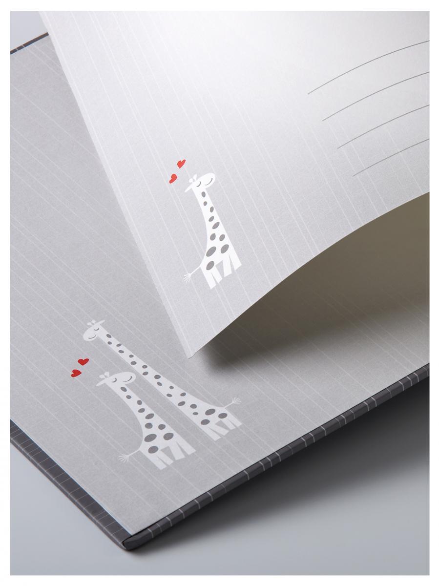 Tässä sidotussa albumissa on harmaanvalkoinen etukansi, jossa on kirahvipainatus. Ensimmäinen aukeama on myös koristeltu söpöillä kirahveilla ja aukeamalla on tilaa myös tekstille.