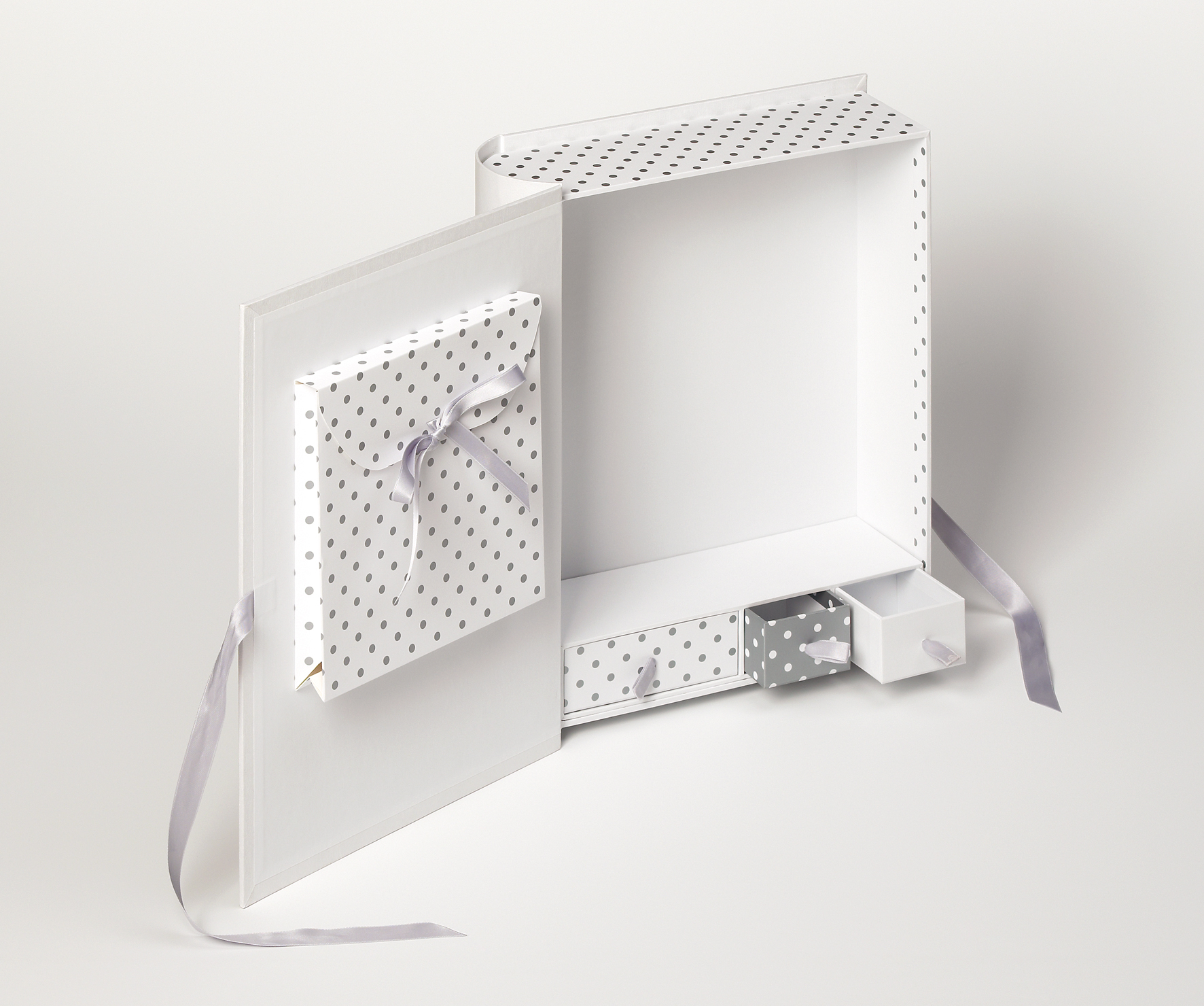 Hieno säilytyslaatikko kuville tai pienille esineille. Laatikon sisällä on 3 pienempää säilytystilaa, jotka soivat esimerkiksi ensimmäisen hampaan säilytykseen. Mukana on myös suljettava säilytyspussi. Voit asettaa oman kuvan laatikon kanteen.