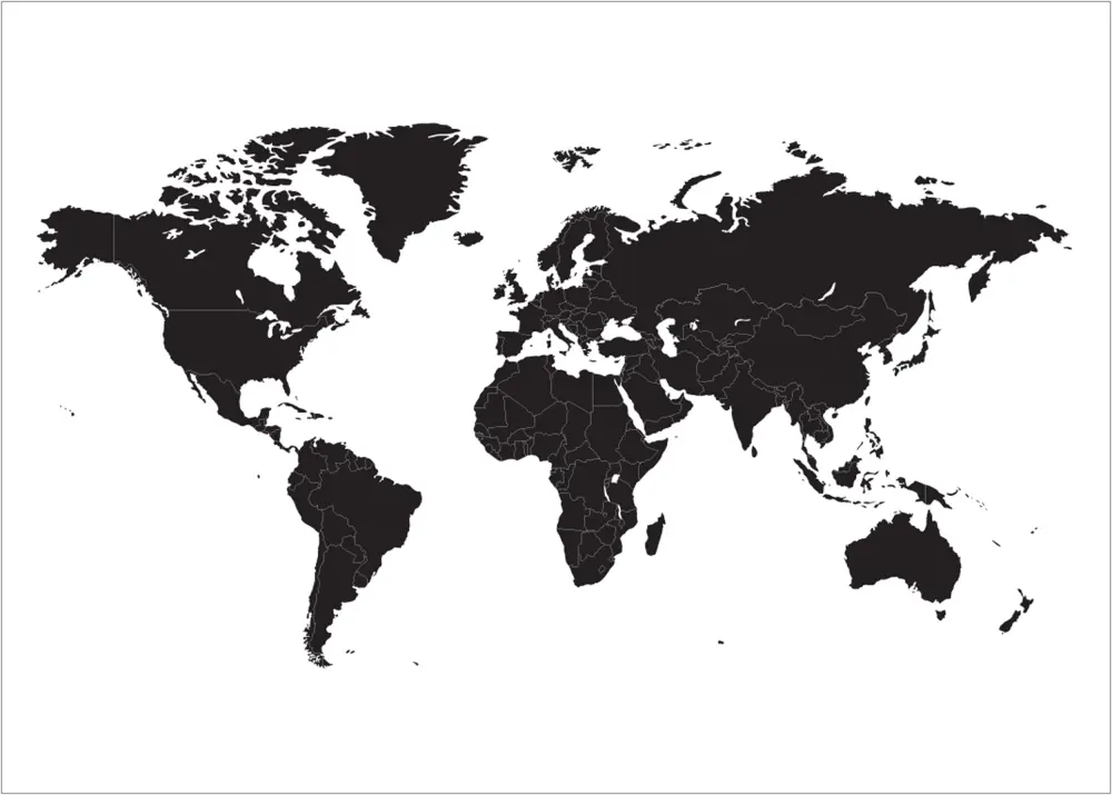 Tyylikäs mustavalkoinen maailmankartta, jossa mantereet ovat mustia ja maat merkitty ohuilla valkoisilla viivoilla. Graafinen juliste sopii yhtä hyvin moderneihin minimalistisiin tiloihin kuin klassisesti kalustettuihin sisustuksiin. Valitse kaunis kehys, joka sopii muuhun sisustukseen, jotta taulu istuu kokonaisuuteen tai kehystä kartta kehyksellä, joka todella korostaa motiivia ja saa sen erottumaan seinällä.