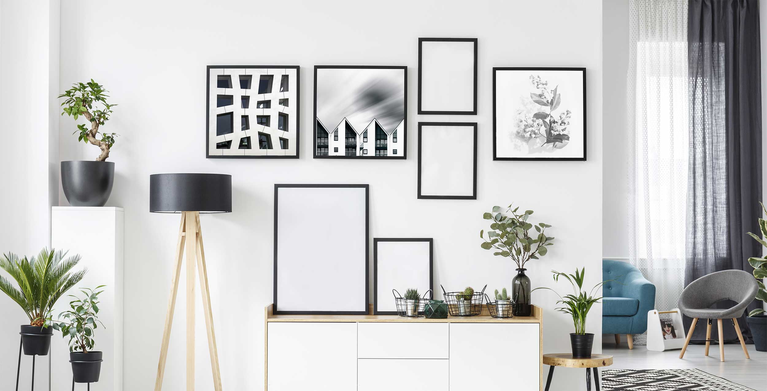 Yhdistä moderneja julisteita, valokuvia, vanhoja lippuja, tuikkuja tai peilejä tauluseinälle. Kerää kaikki suosikkisi ja luo niistä miellyttävä kokonaisuus.