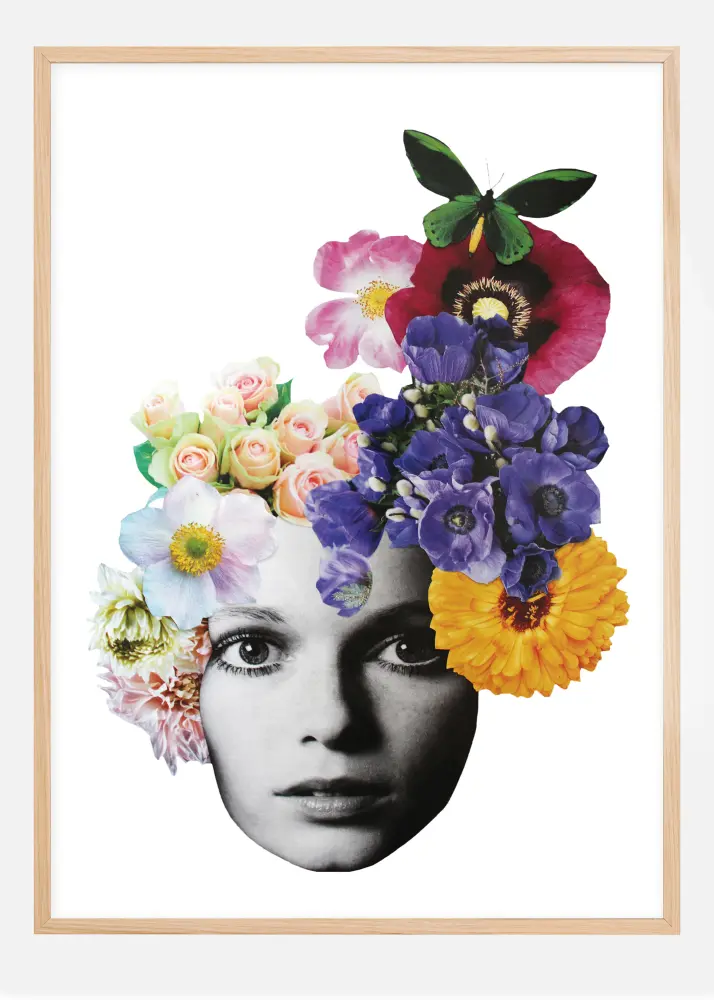 Kaunis kukkajuliste, joka on tehty koristelu- ja pintakäsittelytekniikalla, ja se joka muistuttaa 60-lukua. Kaunis värikimppu kietoutuu yhteen mallin kasvojen kuvan kanssa. Valkoiselle taustalle asetettu painatus luo herkän sommitelman, joka sopii outoon olohuoneeseen tai tyylikkääseen kylpyhuoneeseen.