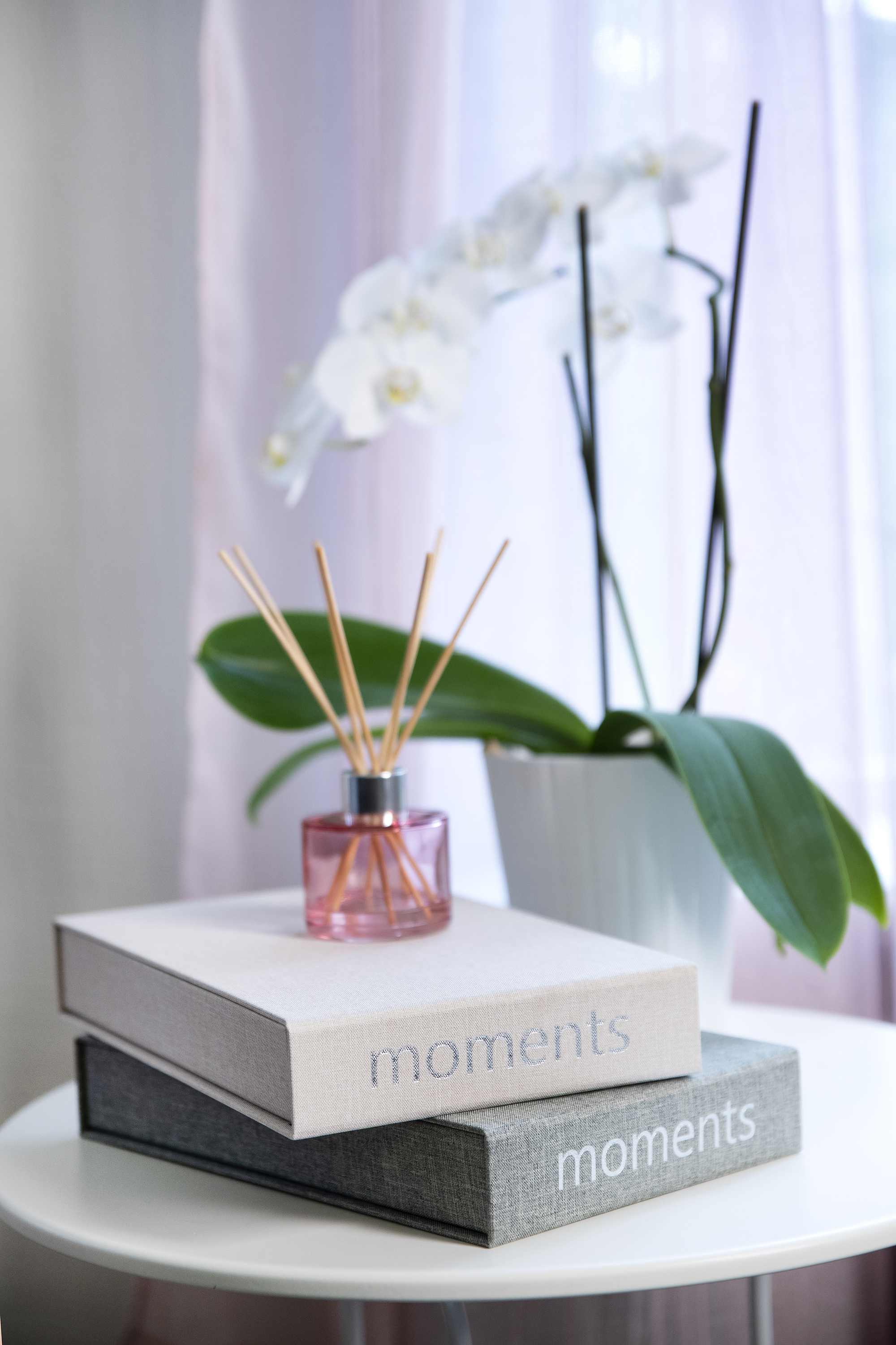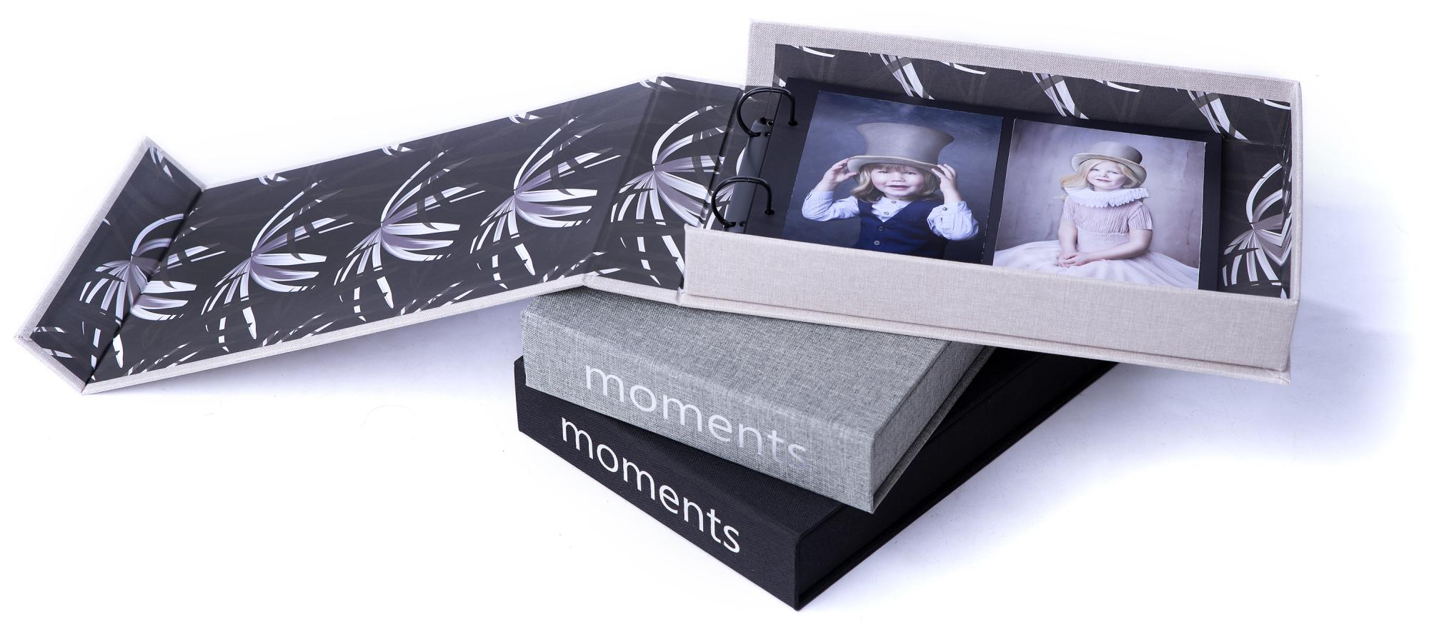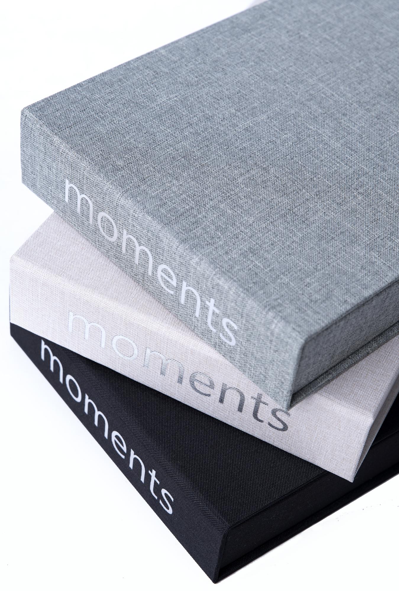 Tämä valokuva-albumi on hillitysti muotoiltu, päällystetty beigellä kankaalla ja albumin selkään on painettu hopeinen teksti ”moments”. Albumi on laatikon muotoinen ja tämä yksityiskohta antaa albumille sekä ylellisen että tyylikkään tunteen. Tämä ylellinen tunne korostuu vielä enemmän kun aukaisee albumin ja näkee kauniin palmulehtikuvion.