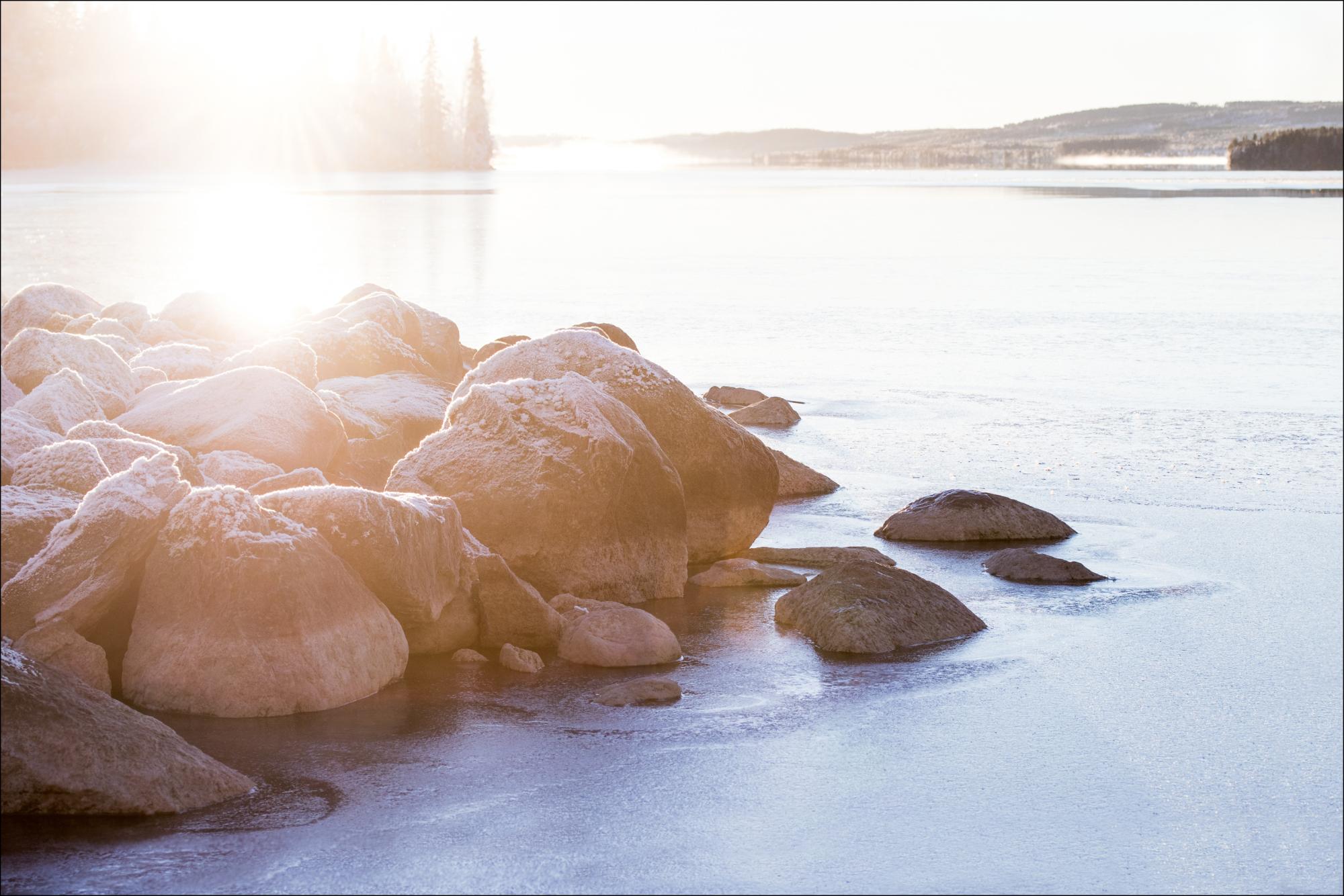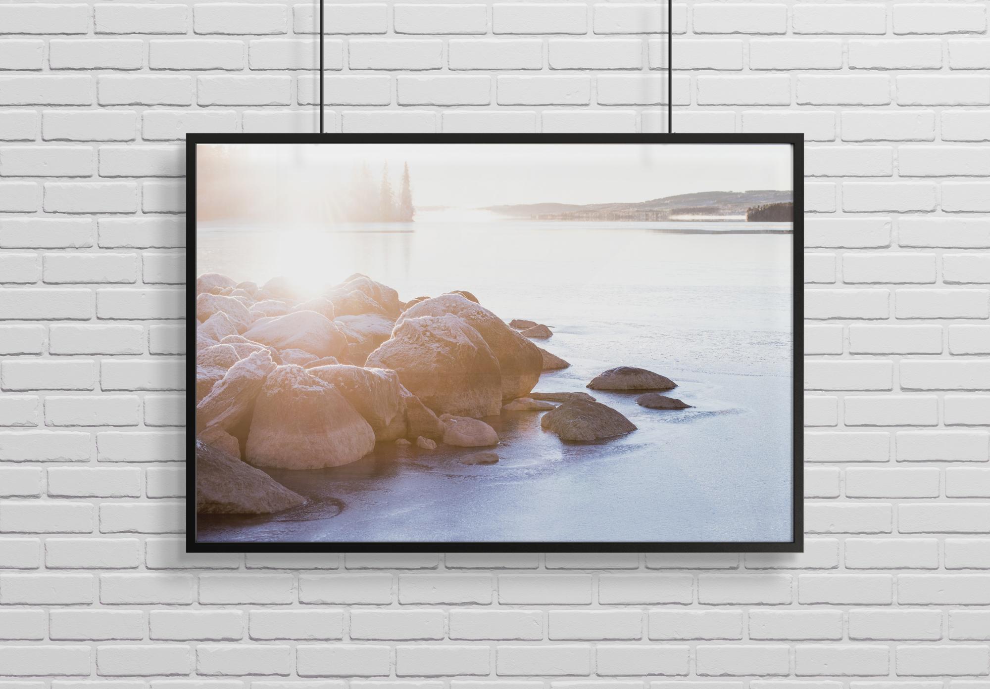 Häikäisevä maisemakuva merenrantalohkareista varhain aamulla. Merivesi heijastaa auringonvaloa ruskeiden lohkareiden läpi luoden valkoisen pinnan. Kun taustalla on alanko, tämä painokuva valaisee varmasti olohuoneesi.