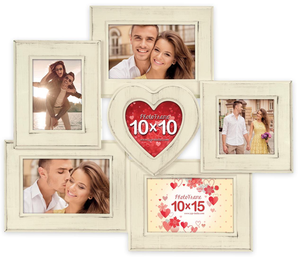 Tämä on kauniin romanttinen kollaasikehys. Keskellä on sydämen muotoinen kehys, jota muut kehykset, sekä vaakatasoiset että pystysuuntaiset, ympäröivät. Kuva, jonka valitset tähän kohtaan, tulee todellakin olemaan taulun keskipiste! Tähän kehykseen on mahdollista kehystää 6 eri kuvaa kooltaan 9x13 cm, 10x10 cm ja 10x15 cm. Tämä kollaasikehys on hienon kermanvärinen ja se on valmistettu komposiitista. Sisältää seinäkiinnikkeen.