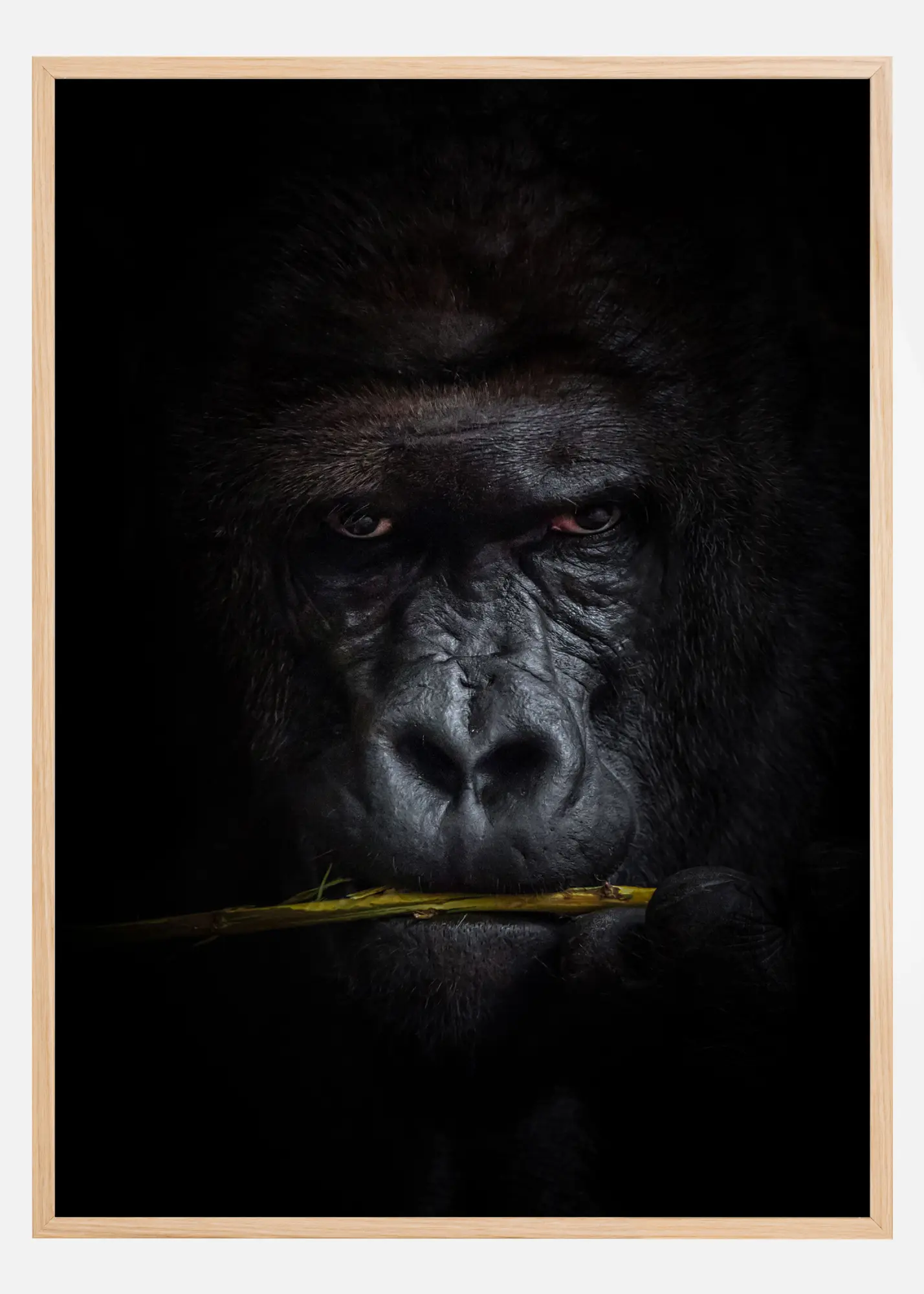 Lähikuva gorillasta, joka nakertaa oksan kuorta. Katse on suunnattu valokuvaajaan, ja tumma turkki sulautuu mustaan taustaan luoden upeaa syvyyttä aiheeseen. Vaikuttava juliste intiimillä kohtaamisella yhden sademetsän suurimman primaatin kanssa.