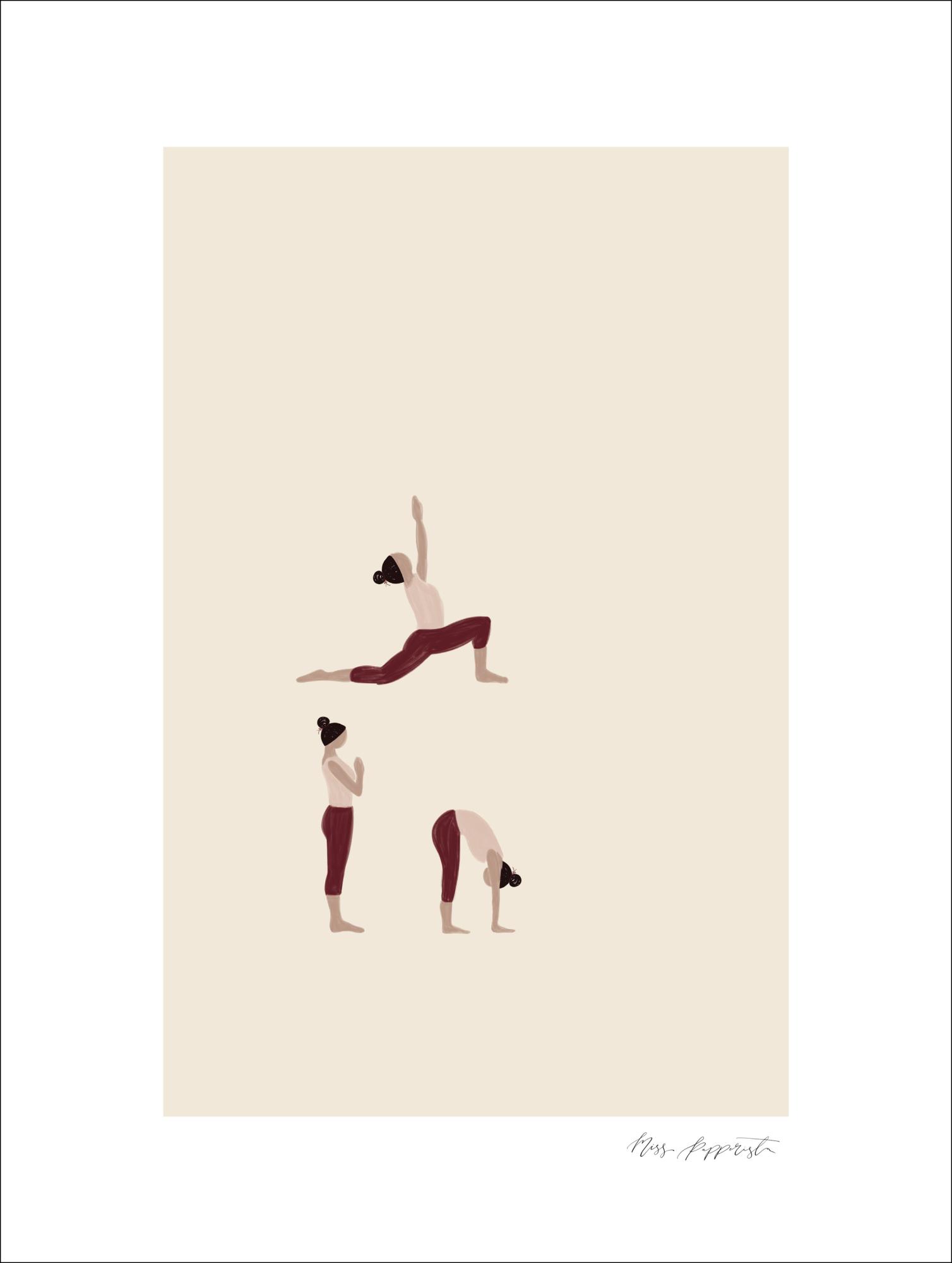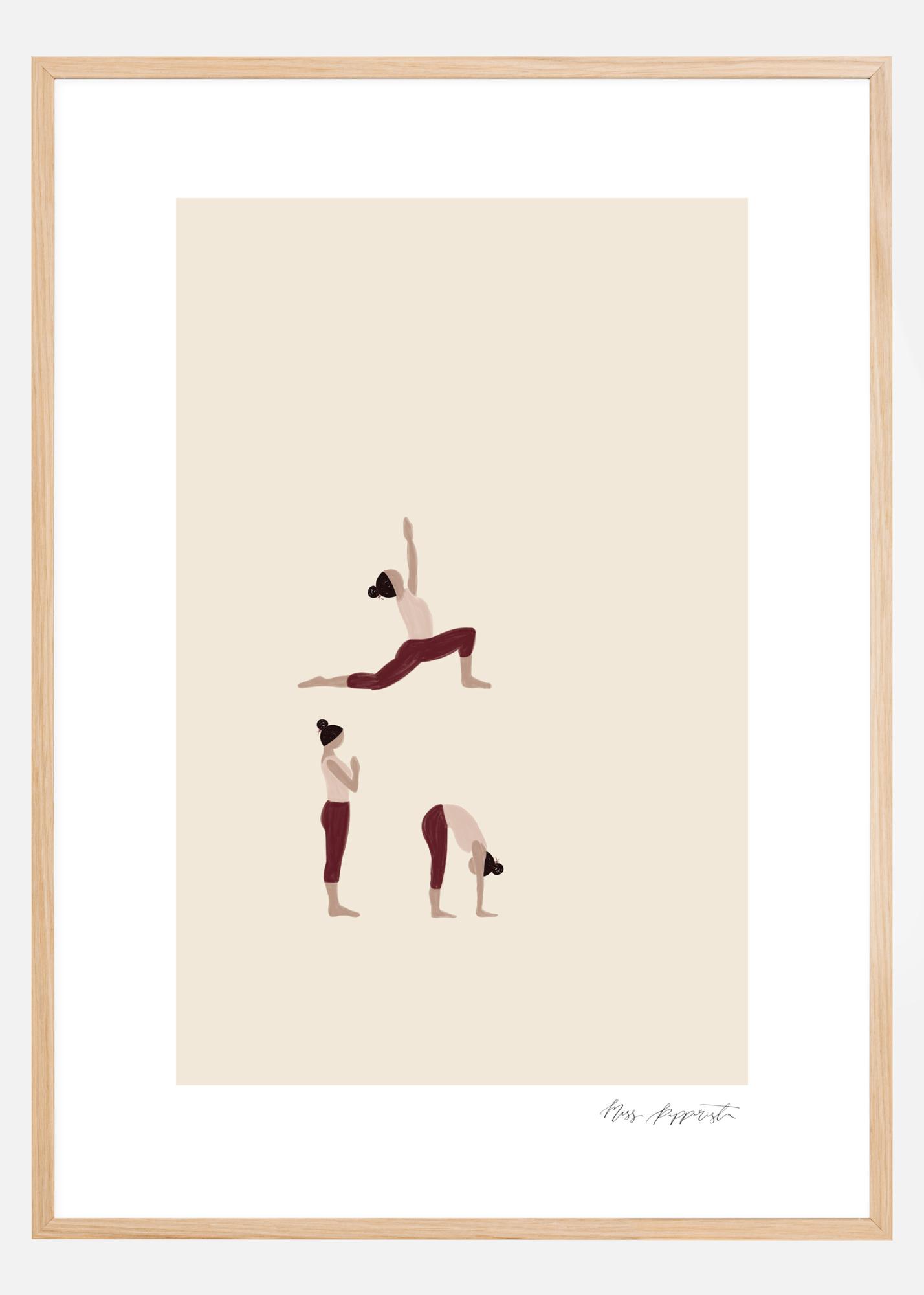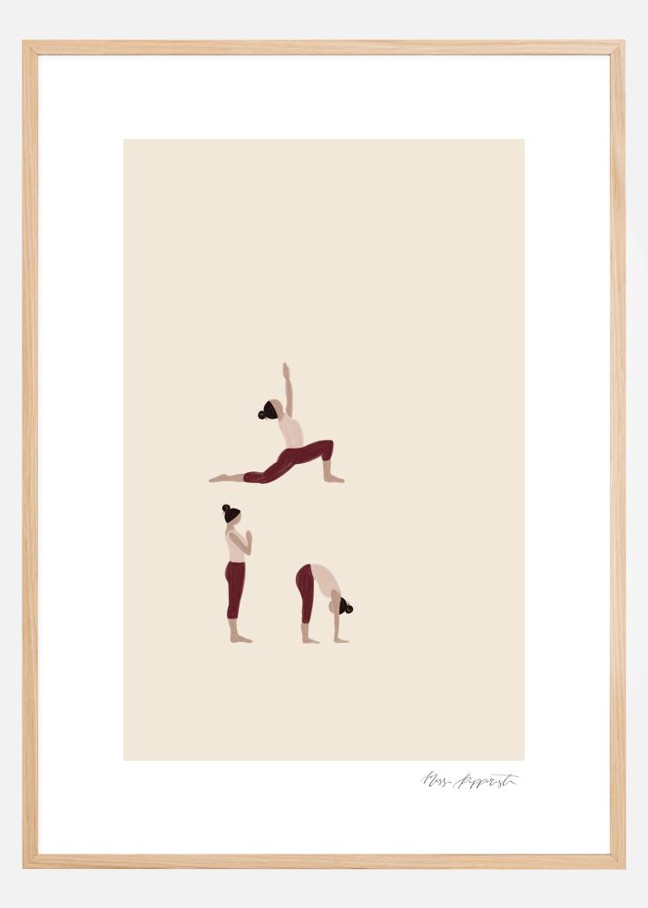 Taideteos joogaa harjoittelevasta naisesta. Kermanväriselle pinnalle asetettu nainen on kolmessa eri asennossa. Kaikki asennot on toteutettu täydellisesti naisen ollessa koko ajan jaloillaan. Täydellinen kuva ripustettavaksi joogatunnille tai kuntosalille.