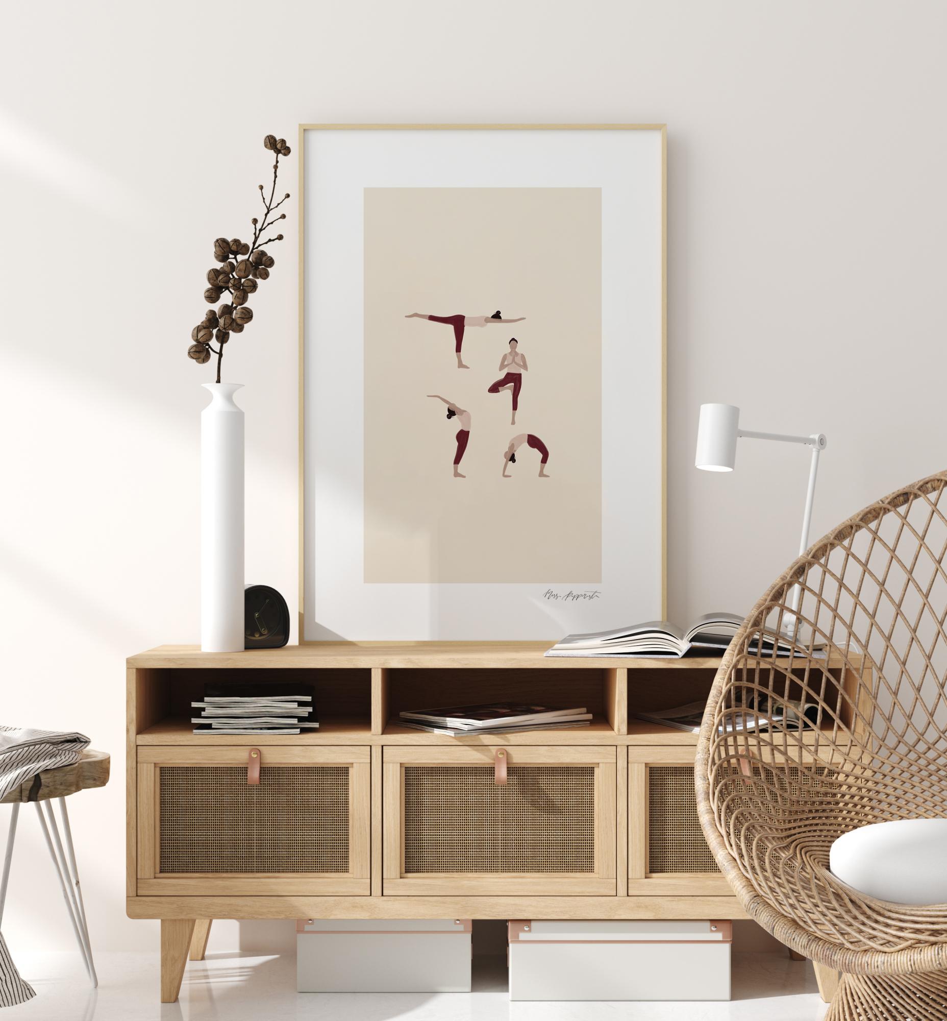 Informatiivinen juliste kauniissa pastellisävyissä, joka esittää neljää erilaista jooga-asentoa. Yksinkertainen ja tyylikäs taulu, jonka on luonut Miss Papperista. Yhdistä mielellään Miss Papperistan Namaste ja Namaste II kanssa saman teeman mukaiseksi kollaasiksi.