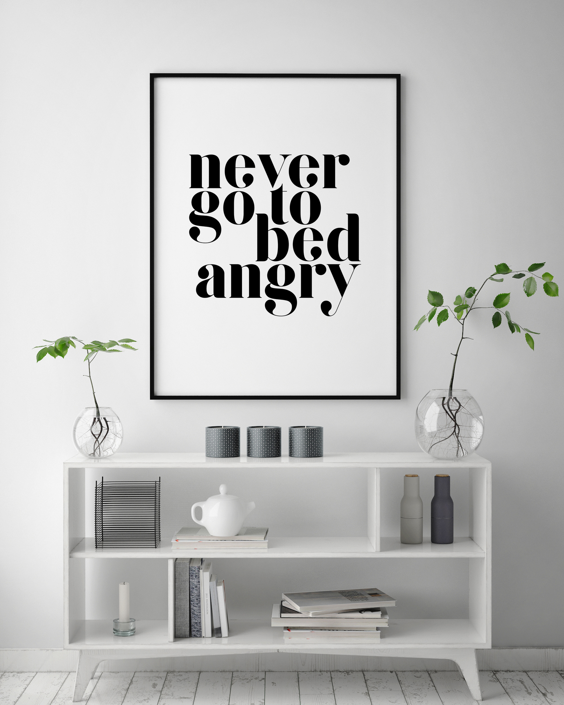 Juliste, jossa kuuluisa lause "älä koskaan mene vihaisena nukkumaan" on painettu pienillä kirjaimilla ja lihavoitu. Kirjoitus on tehty mustalla musteella valkoiselle pinnalle. Makuuhuoneesi seinällä tämä juliste muistuttaa sinua aina olemaan rauhallinen ennen nukkumaanmenoa. Täydellinen juliste, joka tekee nukkumisesta terveellistä ja nautinnollista.