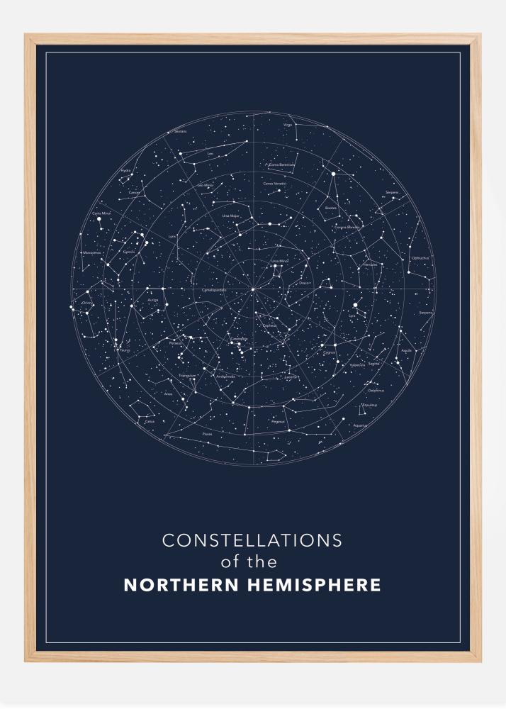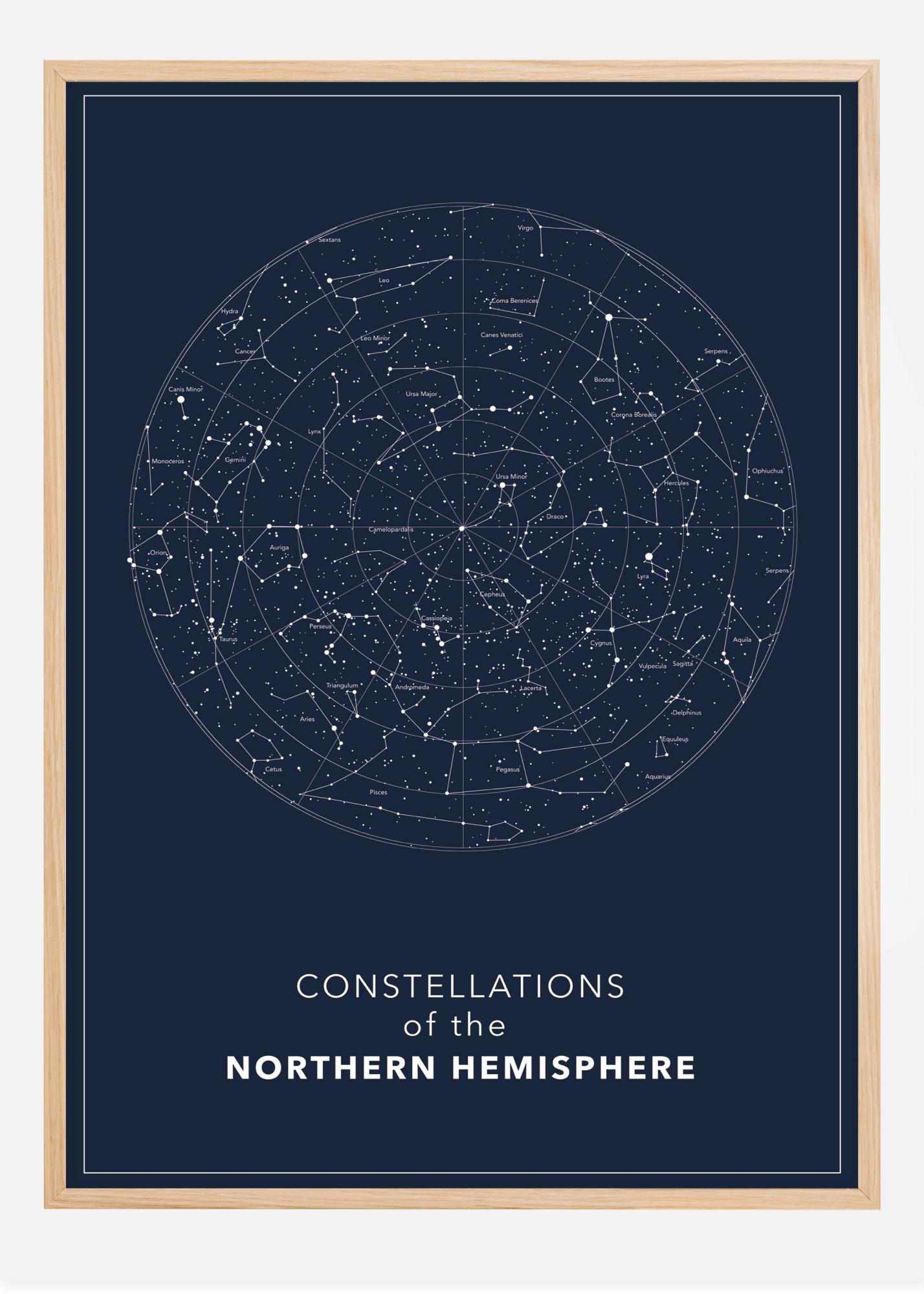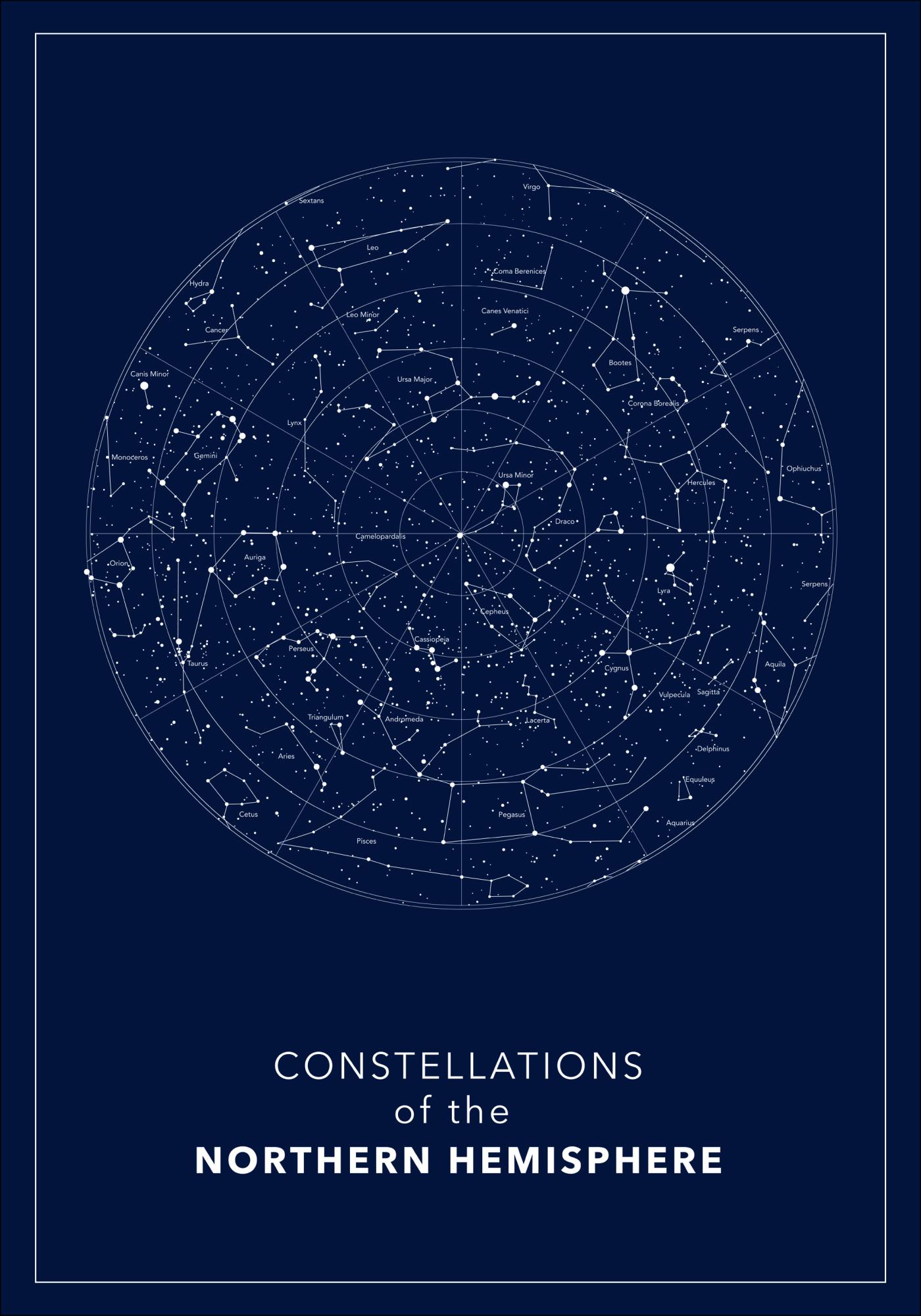 Kimaltava juliste valkoisesta ympyrästä, jossa on pohjoisen pallonpuoliskon tähtikuvioita. Tähdistöt ovat korostettu heikolla valkoisella viivalla, jonka alle on kirjoitettu nimi. Tämä tummansiniselle taustalle asetettuna on erittäin selkeä selitys pohjoisesta pallonpuoliskosta. Ihanteellinen vedos studioon ripustettavaksi.