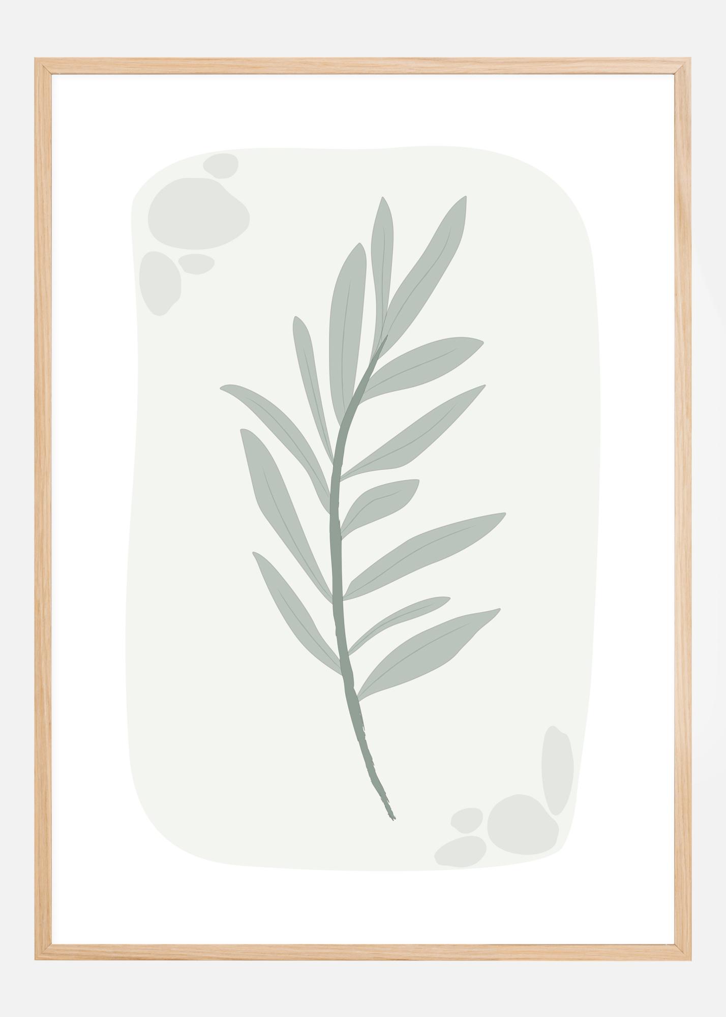 Rauhallinen kuva oliivinlehdestä kermanvärisellä pohjalla. Oliivinlehden pehmeät vihreät sävyt sulautuvat täydellisesti kermanväriseen taustaan. Vasemmassa yläkulmassa ja oikeassa alakulmassa on maalattu neljä beigen väristä kiveä. Tämä kuva näyttäisi kauniilta kermanväriselle seinälle ripustettuna.
