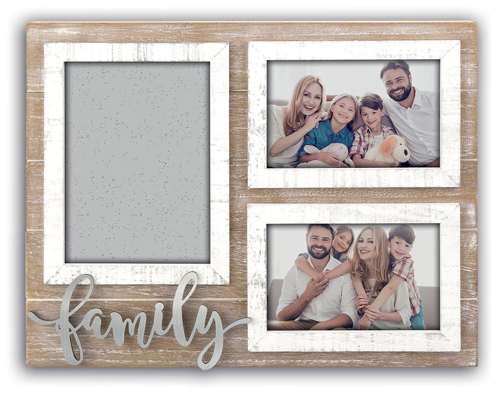 Valkoinen, kuluneen oloinen puinen kollaasikehys, sopii hänelle, joka etsii vintage-ilmettä kotiinsa. Kehyksessä on paikka 3 erikokoiselle kuvalle ja siinä on lisäksi koristeena sana"Family".