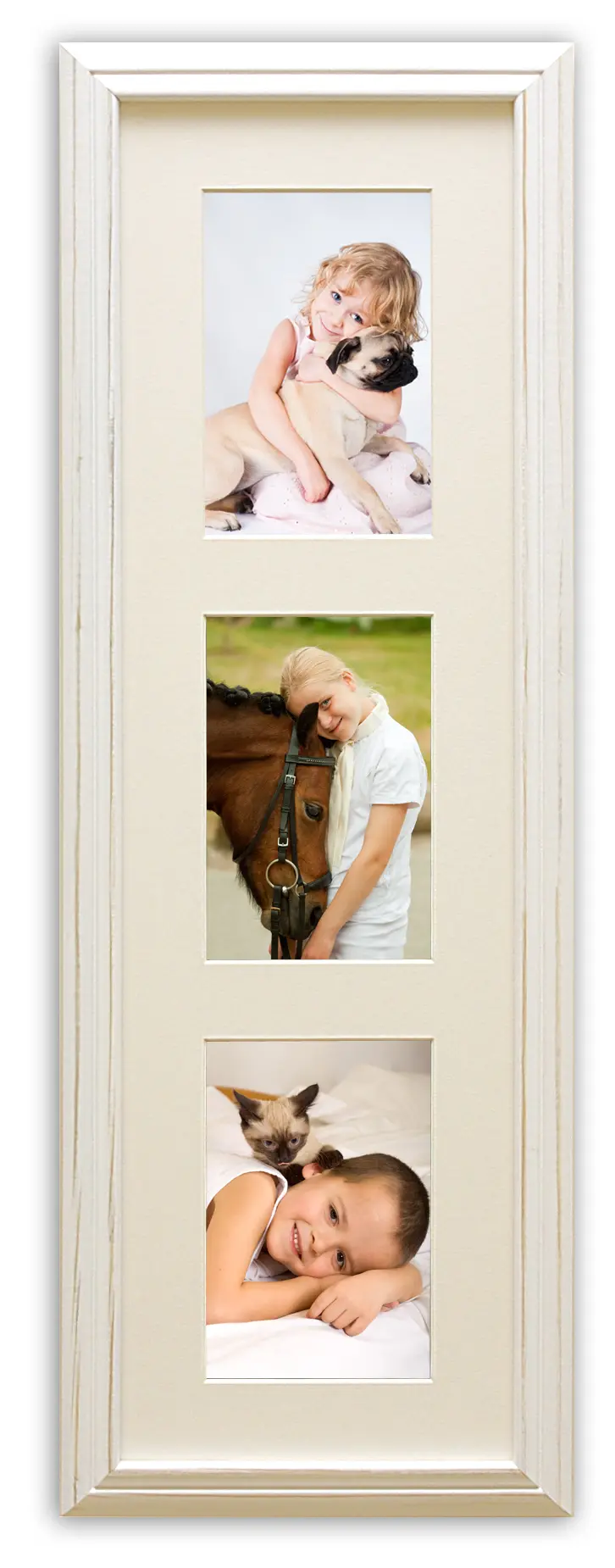 Kollaasikehys, jossa on tilaa 3 kuvalle. Vintagetyylinen puukehys näkyvissä olevilla valkoisilla puunkuvioilla ja kulutetulla pinnalla. Tällä kehyksellä on oma erityinen luonteensa.