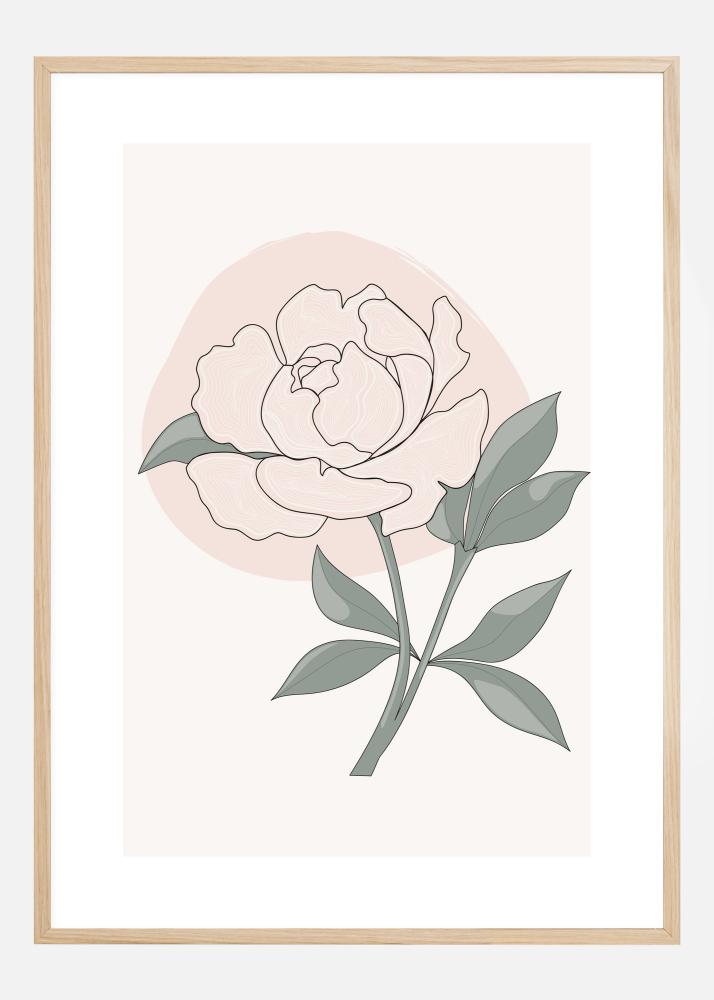 Taiteilijan jäljitelmä pionin varresta, jossa on vaaleanpunainen kukka. Vaaleanpunainen kukka on sijoitettu beigen väriselle taustalle persikan värisen kuvion päälle, ja lehdet ovat rajattu mustalla. Tuo tämän kukan herkkyys kotiisi.