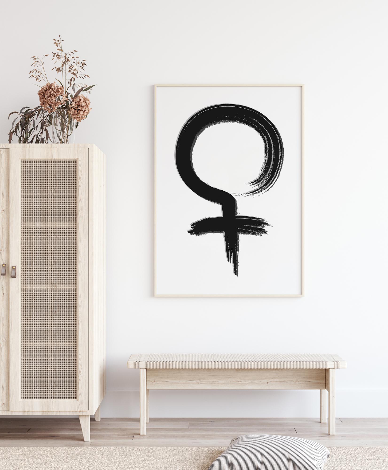 Yksinkertainen mustavalkoinen juliste, joka kuvaa naisen sukupuolimerkkiä epätäydellisellä ympyrällä. Valkoiselle taustalle asetettu musta symboli on häivytetty ympyrän lopussa. Täydellinen kuva ripustettavaksi naisympäristöön.