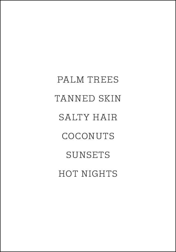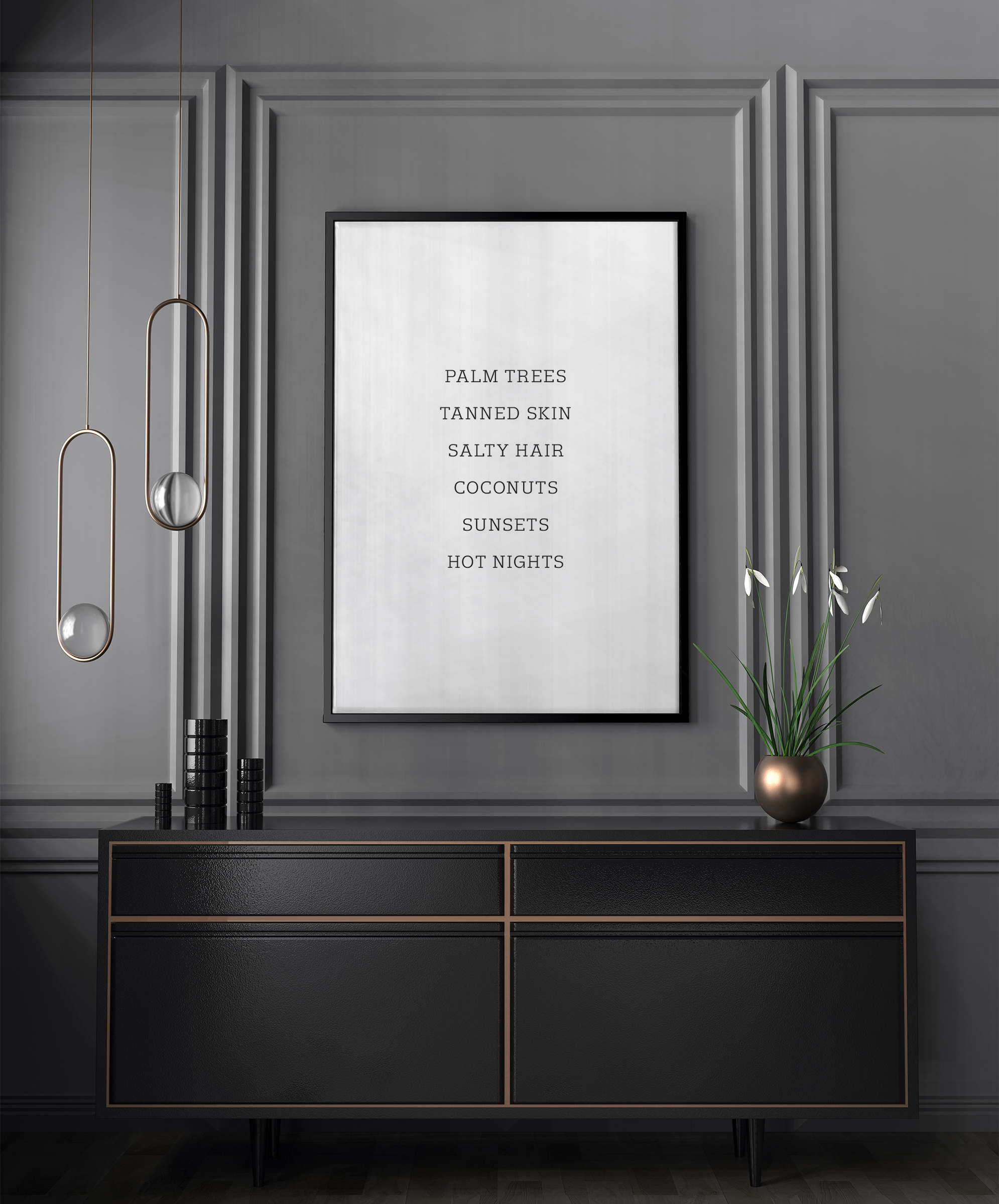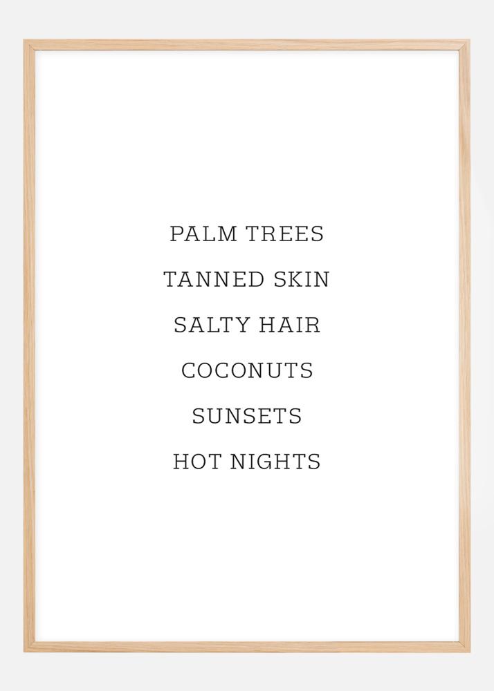 Mustavalkoinen printtikuva, joka välittää kesäisen viestin. Mustalla fontilla valkoisella pinnalla sanat lukevat: PALMUT, RUSKETTUNUT IHO, SUOLAISET HIUKSET, KOOKOSPÄHKINÄT, AURINGONLASKUT, KUUMAT YÖT. Keskelle kohdistetut sanat muistuttavat kesäkaudesta. Lisää ripaus kesää moderniin olohuoneeseesi tällä printtikuvalla.