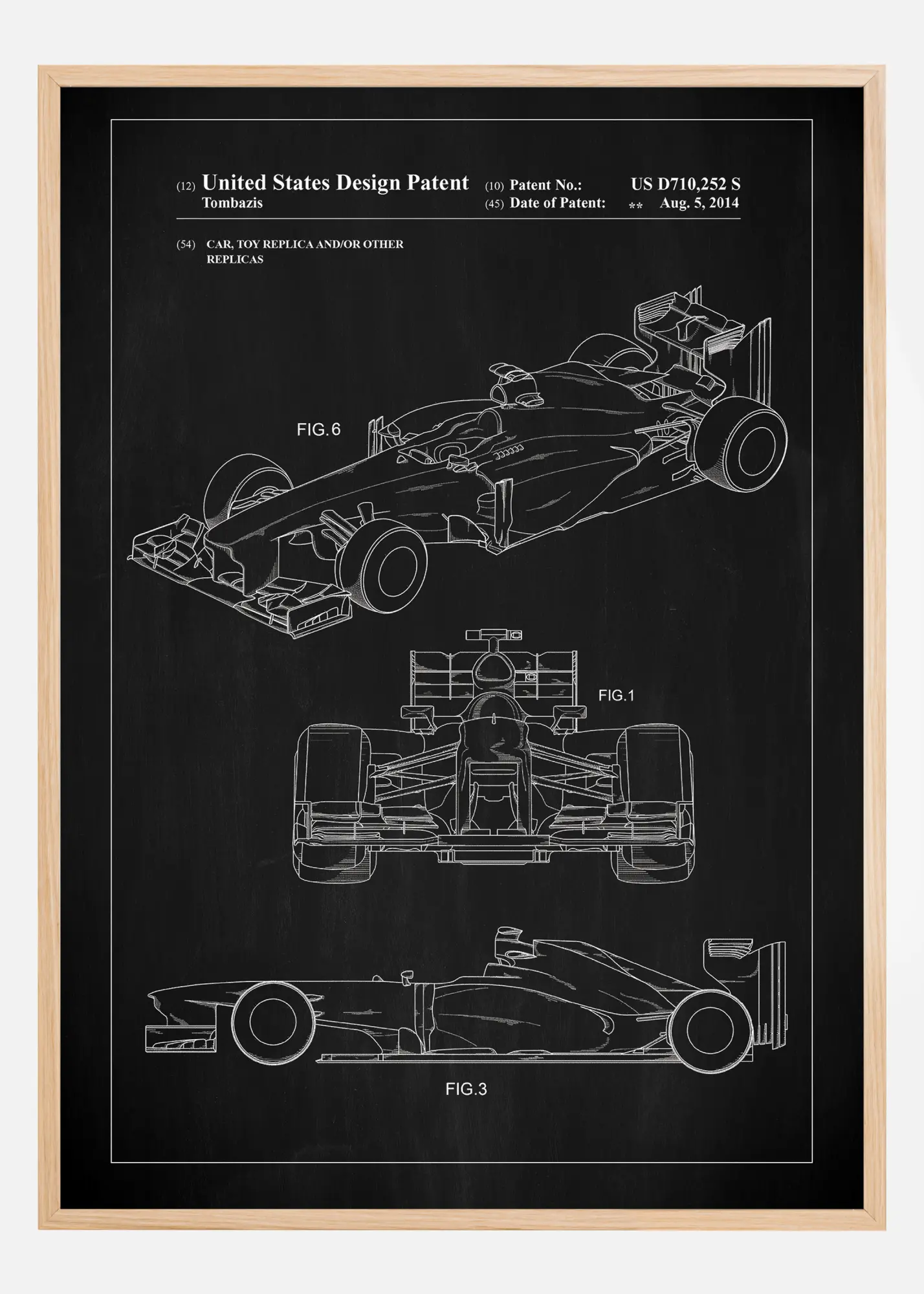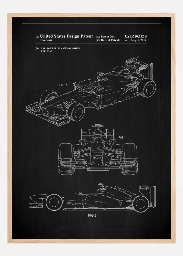 Tämä patenttijuliste korostaa eleganttia ja monimutkaista Formula 1 -auton muotoilua Yhdysvaltain mallisuojapatentin US D710,252 S mukaisesti, päivätty 5. elokuuta 2014. Sen erottuvien linjojen ja aerodynaamisten muotojen ansiosta auton muotoilu on vangittu useista näkökulmista, mikä antaa kattavan kuvan sen ikonisesta ja teknisesti edistyneestä luonteesta. Tämä muotoilu on perustavanlaatuinen kytkettynä formula-autokilpailujen korkeaan suorituskykyyn ja nopeuteen.