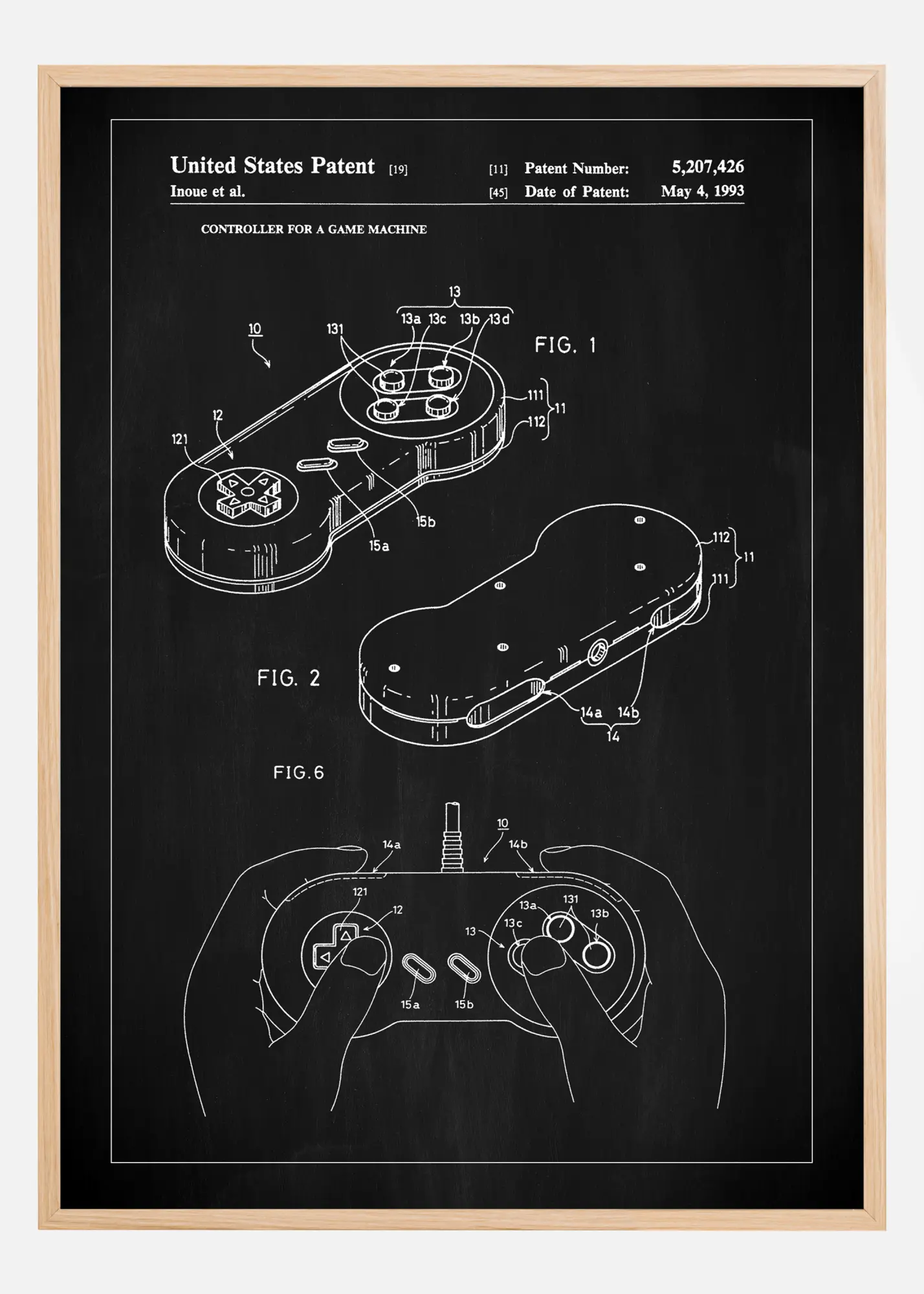Tämä patenttijuliste tuo esille Nintendon pelikonsolin klassisen ohjaimen suunnittelun, patenttinumero 5,207,426, päivätty 4. toukokuuta 1993, tyylikkäällä mustalla taustalla. Patenttikuva esittää ohjaimen eri näkymiä, mukaan lukien ylä- ja alapuoli sekä käyttäjän näkökulma, kuvaten yksityiskohtaisesti nappien ja ohjainten muotoilun, jotka ovat keskeisiä pelaajien vuorovaikutuksessa digitaalisten pelimaailmojen kanssa.
