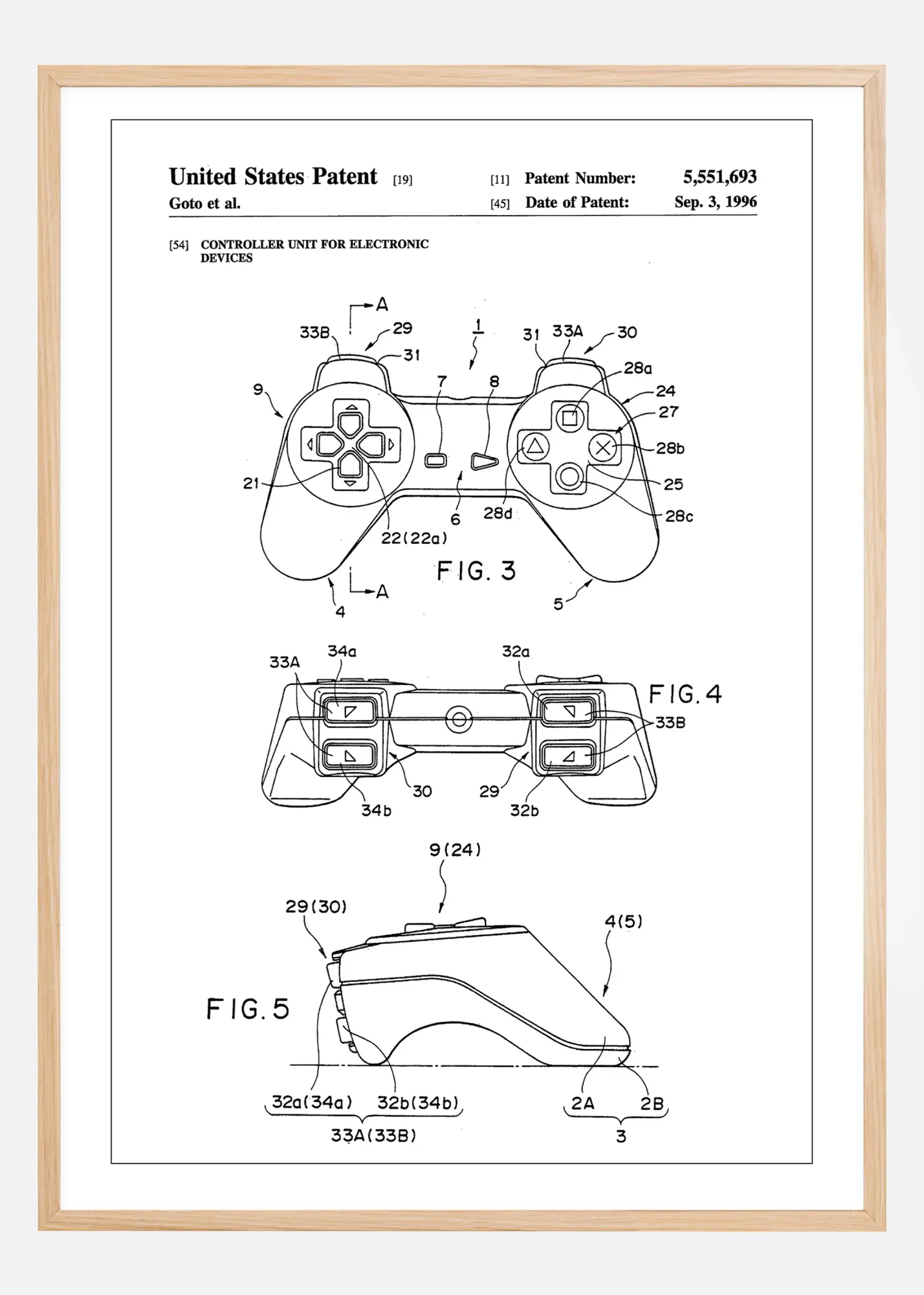 Tämä patenttijuliste kuvaa Playstation-peliohjainta, patenttinumerolla 5,551,693, myönnetty 3. syyskuuta 1996. Designi esittelee ohjaimen yksityiskohtaisen layoutin ja toiminnot eri näkökulmista, mikä ei ole ainoastaan sen toiminnallisen suunnittelun tunnustus, vaan myös sen vaikutus kasvavassa elektronisten pelien maailmassa. Tämän tyyppisestä peliohjaimesta on tullut standardi peliteollisuudessa ja sillä on ollut ratkaiseva rooli siinä, miten koemme digitaaliset pelit.
