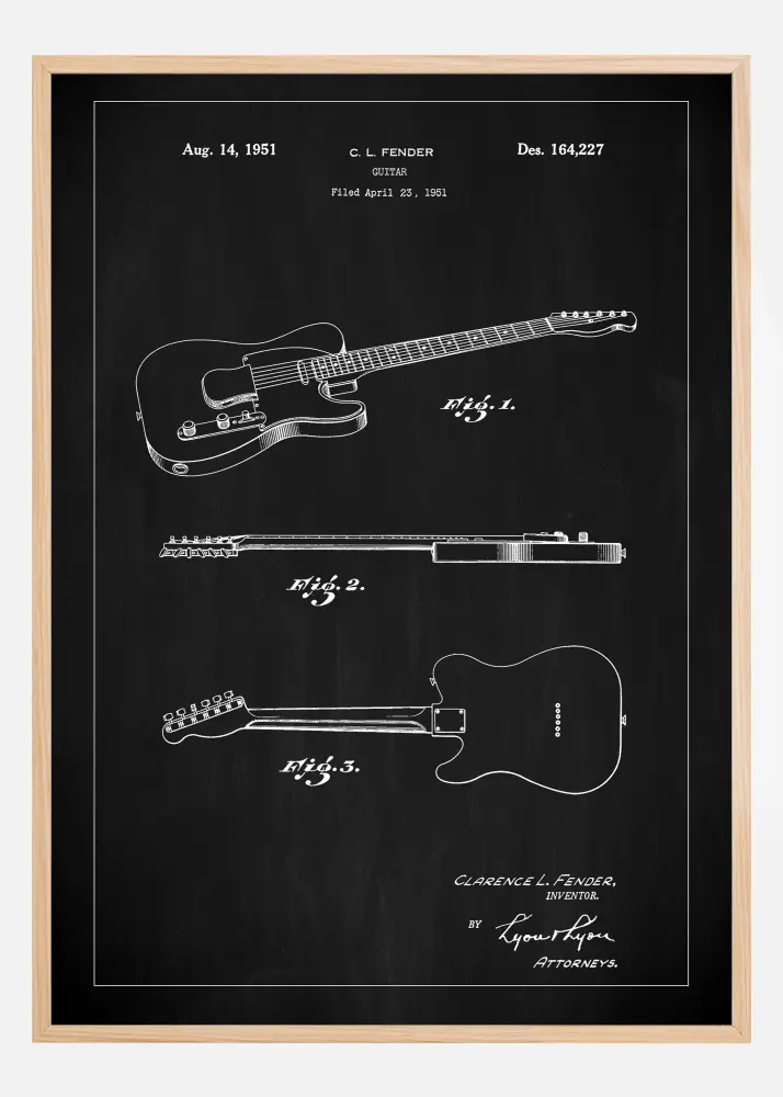Tämä patenttijuliste mustalla taustalla antaa voimakkaan visuaalisen vaikutelman, täydellinen Clarence L. Fendersin sähkökitara-suunnittelun korostamiseen, patenttinumerolla 164,227, 14. elokuuta 1951. Kitaran ikoniset ääriviivat ja yksityiskohdat erottuvat terävästi taustaa vasten, mikä tarjoaa puhtaan ja erottuvan esityksen soittimesta kolmesta eri näkökulmasta.