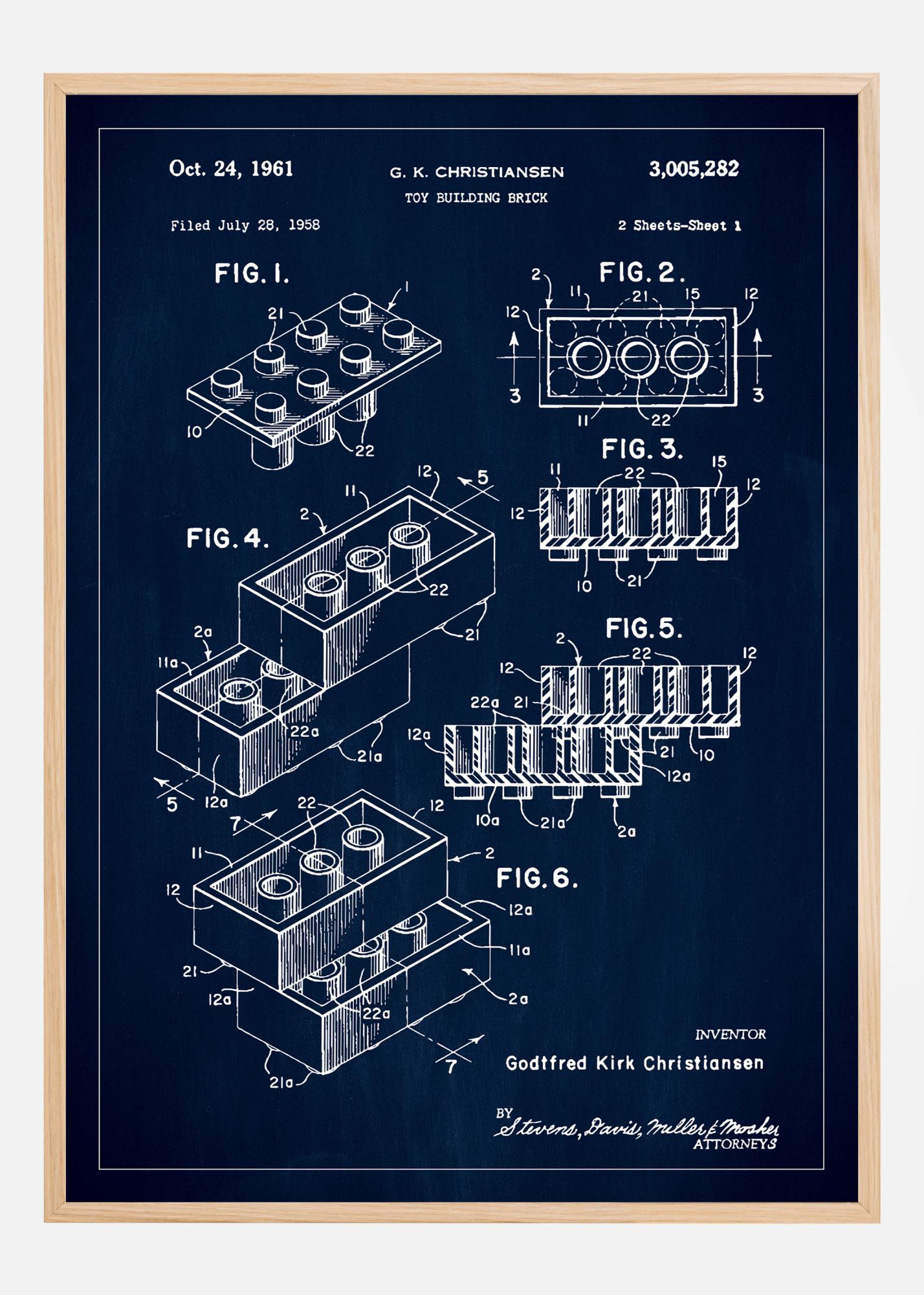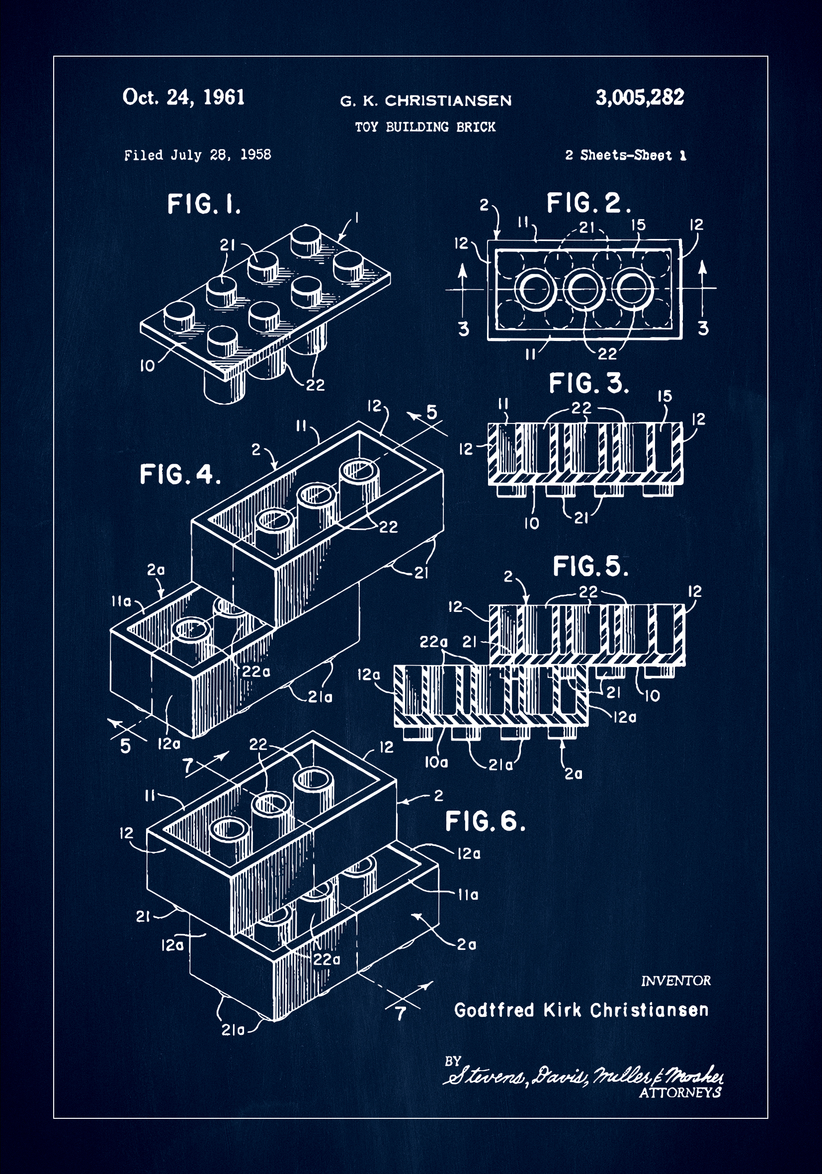 Tämä yksityiskohtainen patenttijuliste kuvaa Legon leikkirakennuspalikan nerokasta suunnittelua, joka muutti luovan leikin ja oppimisen kenttää, ja jonka loi Godtfred Kirk Christiansen. Patenttinumerolla 3,005,282, myönnetty 24. lokakuuta 1961, tämä kuva vangitsee keksinnön olemuksen, joka on inspiroinut ja ilahduttanut sukupolvia rakentajia ja ajattelijoita.