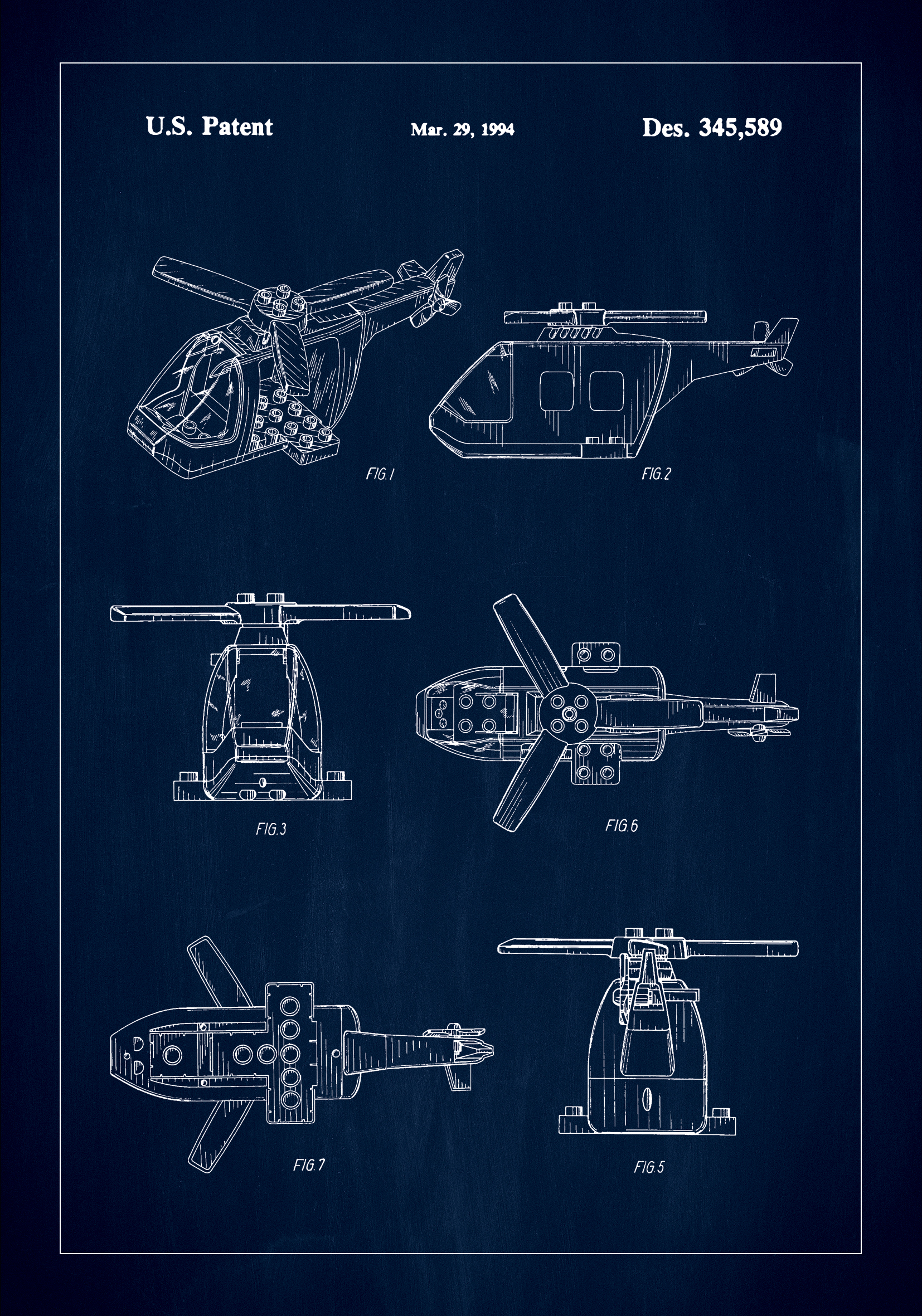 Tämä eksklusiivinen patenttijuliste kuvaa esteettistä ja toiminnallista mestariteosta helikopterista Legolta, Yhdysvaltain patentin Des. 345,589 mukaan, päivätty 29. maaliskuuta 1994. Syvä merensininen tausta, joka kauniisti kontrastoi valkoisten linjojen kanssa, vangitsee tämän patenttiraakennelman edistyneen insinöörityön ja suunnittelun olemuksen. Se on kunnianosoitus innovaatioille ja on ihanteellinen niille, jotka arvostavat teknistä hienostuneisuutta ja historiallisesti vaikuttavaa suunnittelua sisustusvalinnoissaan.