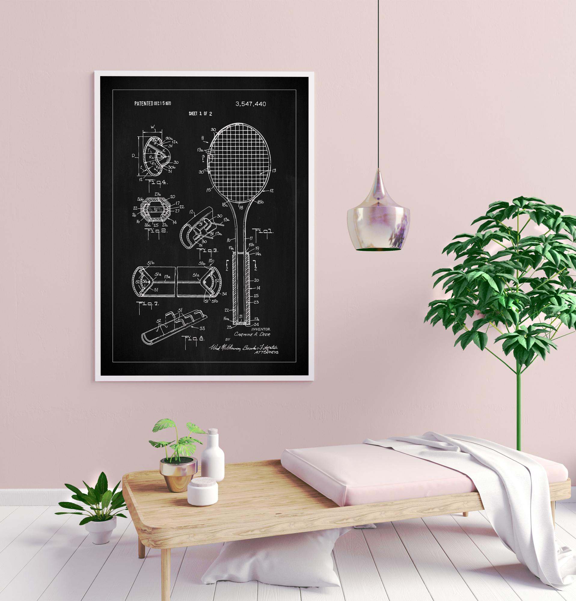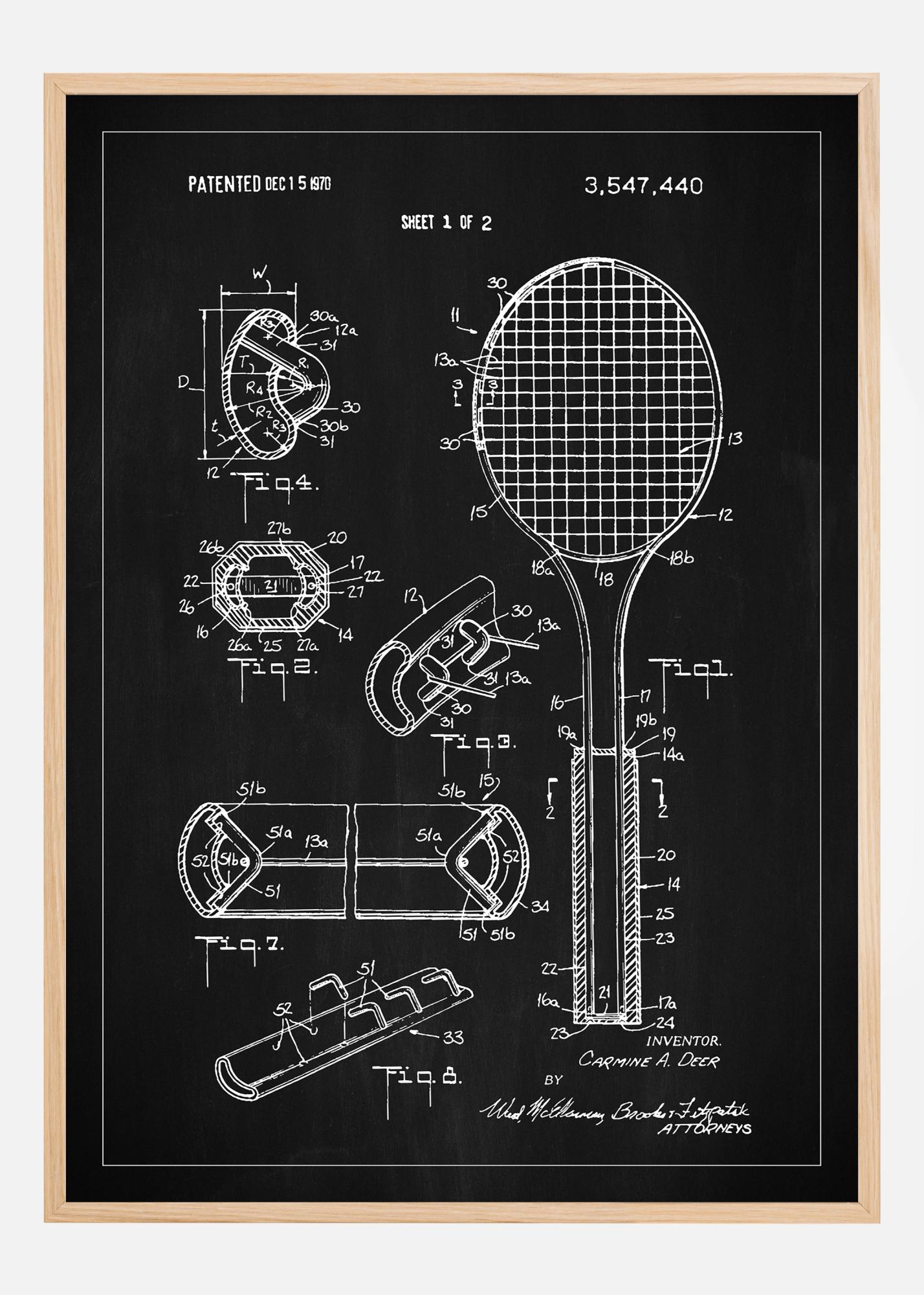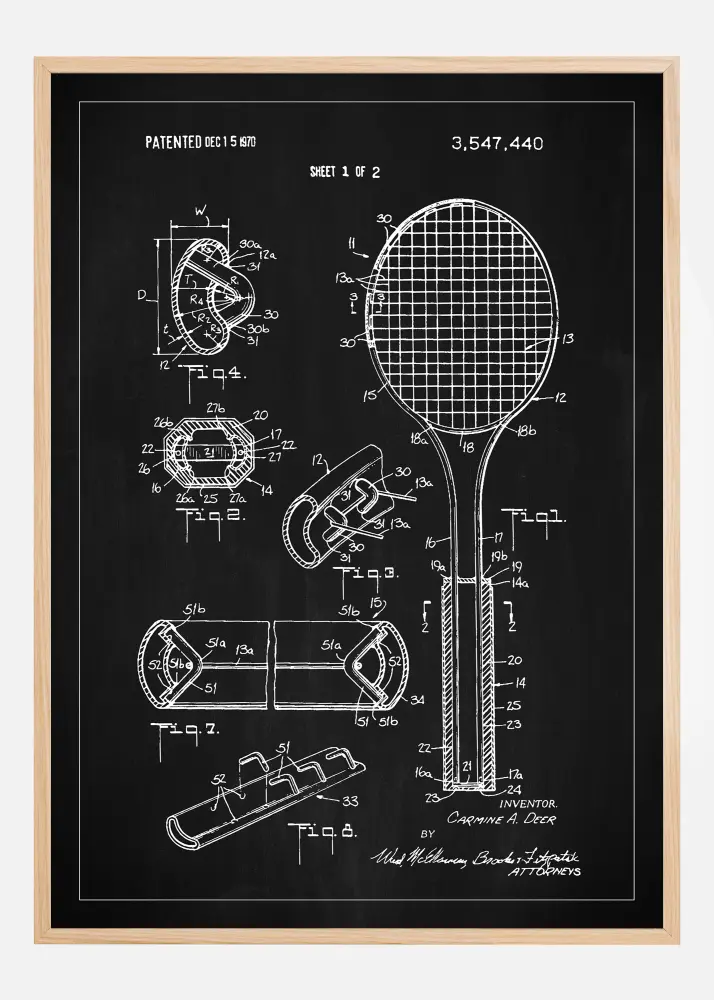 Tämä patenttijuliste esittelee teknisen kuvauksen U.S. patentista 3,547,440, myönnetty 15. joulukuuta 1970. Se on älyllinen ja esteettinen omaisuus, joka tuo ainutlaatuisen luonteen mihin tahansa huoneeseen, ihanteellinen tenniksen harrastajille ja muotoilun ystäville. Julisteen klassinen mustavalkoinen ulkonäkö korostaa yksityiskohtaista tennismailan ja siihen liittyvien osien rakennetta, kuten kahva ja kielet, sekä erilaisia näkökulmia ja rakenneosien leikkauksia, jotka esitetään eri kuvissa.