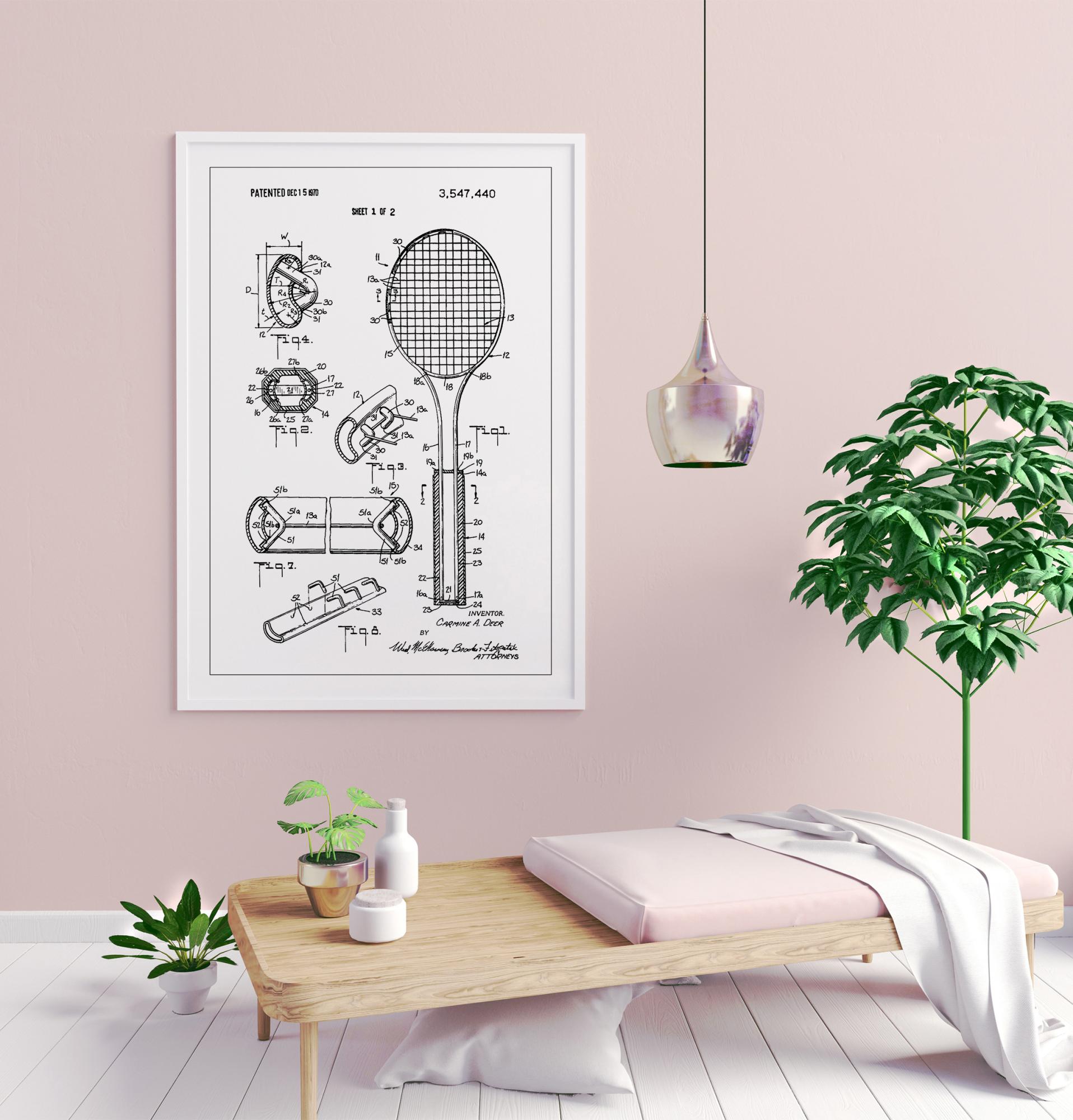 Tämä patenttijuliste esittää teknisen piirustuksen historiallisesta Yhdysvaltain patentista 3,547,440, myönnetty 15. joulukuuta 1970, joka esittelee tennismailan keksinnön. Tarkkojen linjojensa ja yksityiskohtaisten mailan eri osien luonnosten, kahvasta jännityskuvioon asti, ansiosta tämä juliste on todellinen edustus insinööritaidosta ja suunnittelun hienostuneisuudesta.