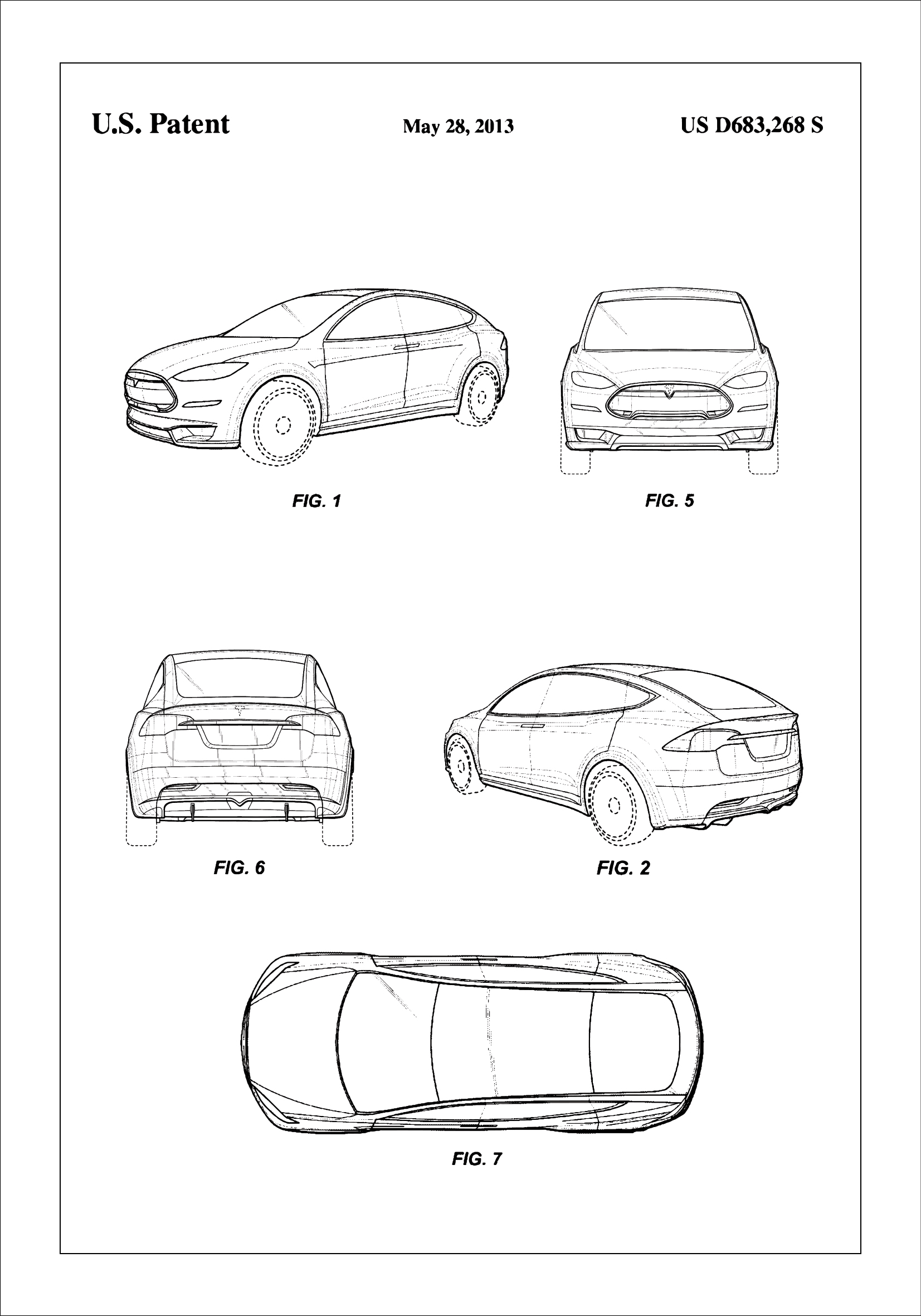 Tutustu innovaatioiden ja tyylin maailmaan tämän erottuvan Teslan patenttijulisteen avulla, jossa ylpeänä esitetään patenttinumero US D683,268 S, myönnetty 28. toukokuuta 2013. Tämä minimalistinen ja tyylikäs patenttijuliste korostaa vallankumouksellista ajoneuvomuotoilua, joka edustaa teknologian huippua ja teollista muotoilua. Juliste kiinnittää huomion terävillä linjoillaan ja tarkilla yksityiskohdillaan, tehden siitä näyttävän sisustuselementin jokaiseen moderniin kotiin tai toimistoon.